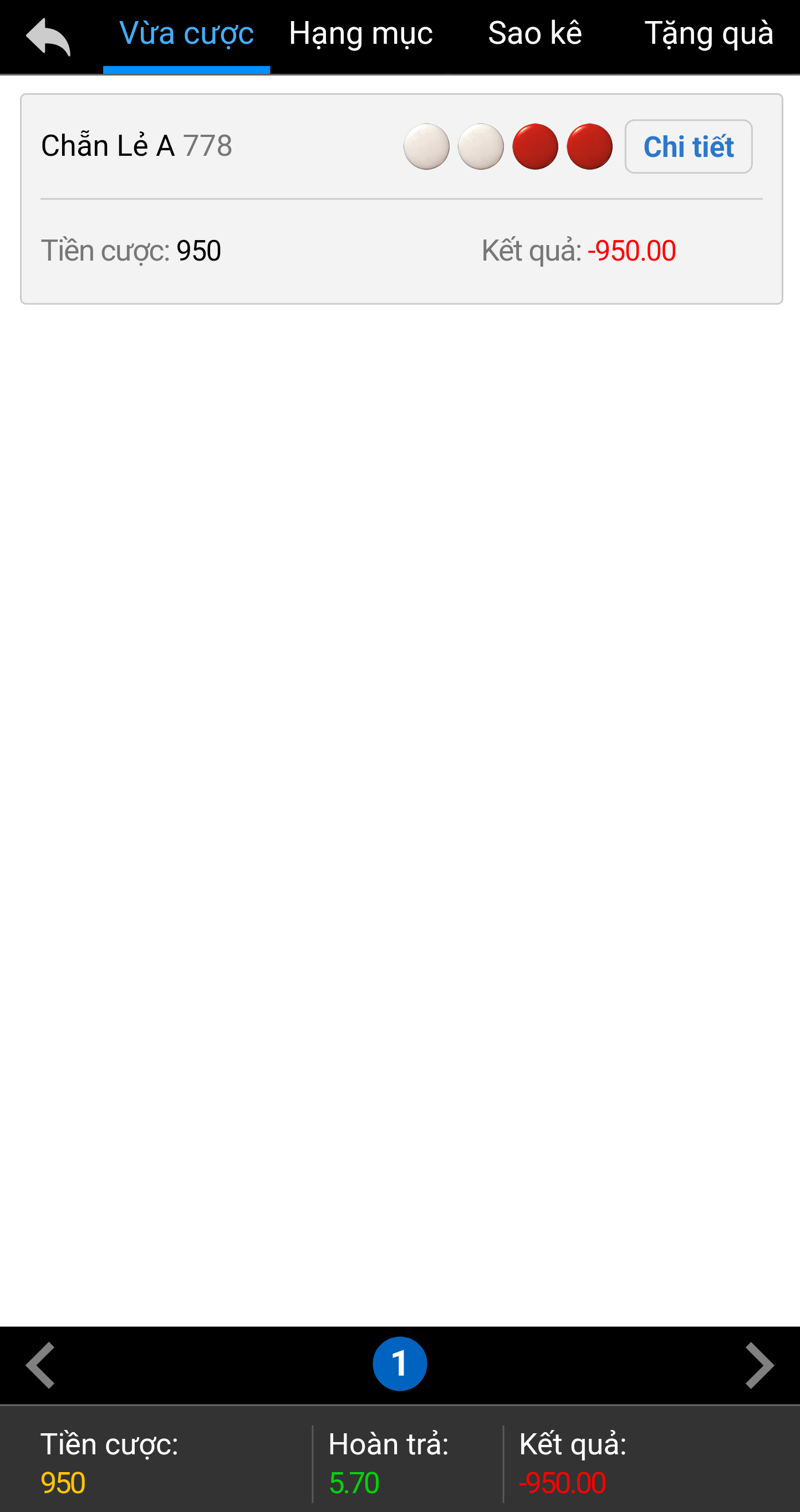 Tao nạp 500k vào chơi. Chơi mỗi ku xổ số và đang lãi 450k và từ khi có cái Tk này tao cũng chỉ chơi duy nhất Ku xổ số, đéo chơi cái khác bao giờ. Tổng tk đang còn 950k. Tự nhiên thấy tk văng ra. Vào lại thì Tk còn 0 đồng. Thấy nó đặt cược 1 phát bên Ku Casino 950đ và bay hết.