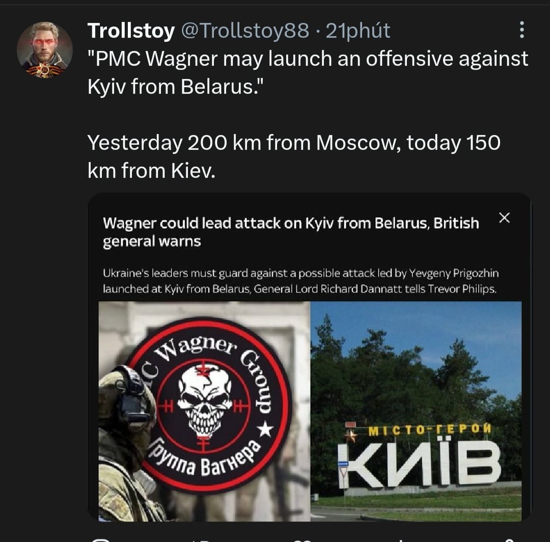 Sky News dẫn lời tướng Anh, Dannatt nói rằng PMC "Wagner" có thể phát động một cuộc tấn công vào Kiev từ Belarus.