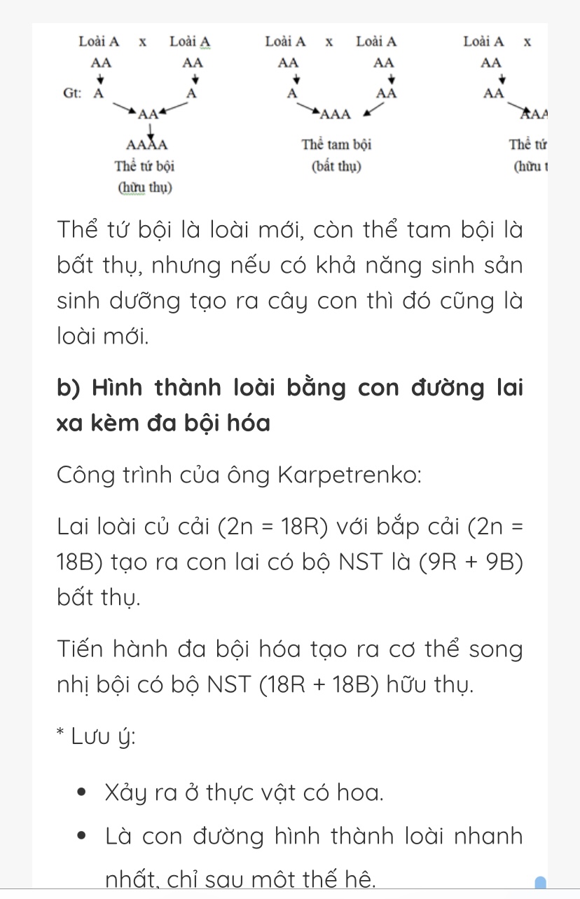 Cái mày nói là cách hình thành loài mới bằng lai xa và đa bội hoá rồi, cái này con lai thể tam bội không sinh sản được nhưng đa bộ hoá tạo thành cặp song nhị bội thì tạo thành loài mới đc, mà đây là cách người ta lai tạo giống nhân tạo như các giống cải, hoặc chó pug theo ý muốn chứ không phải tiến hoá tự nhiên, còn ngoài tự nhiên thì như kiểu lừa với ngựa thành con la, mà con la đéo đẻ đc nên nó ko thể là 1 loài mới đc.