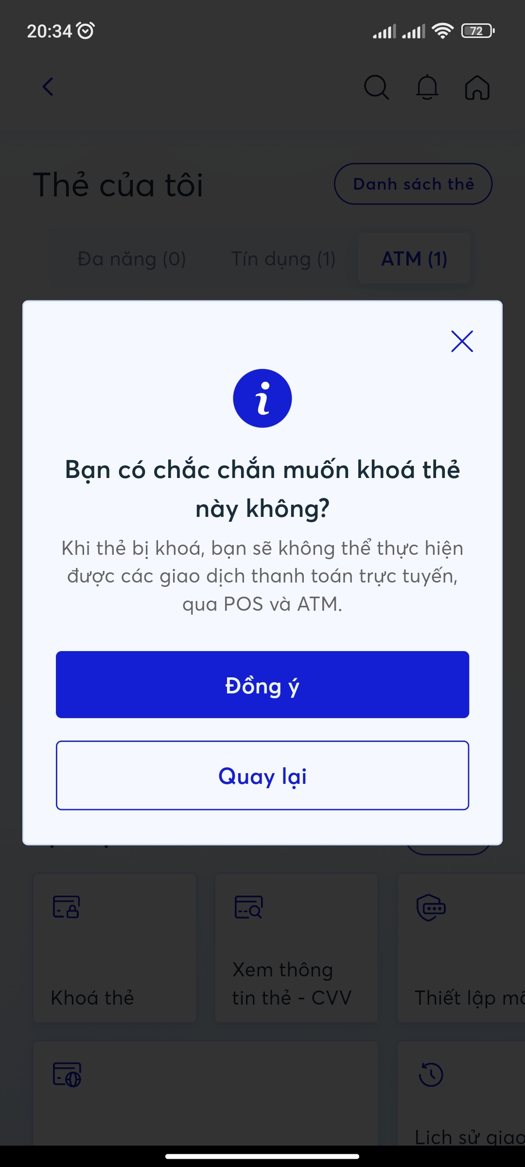 mày muốn khoá thẻ nhưng vẫn muốn tiêu online ? thế thì có cái lzn mà được.khoá này là khoá hết. tao muốn khoá mỗi vật lý thôi vẫn gd online đc cơ