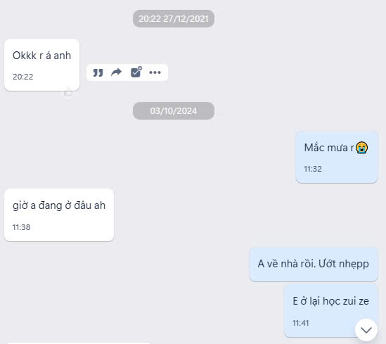 --Tụi bây chú ý ở đoạn tin nhắn ngày 03/10/2024, đây là lần tụi tao nhắn tin với nhau sau gần ba năm không liên lạc hay nhắn tin gì, lúc này như tao đã nói, ẻm vừa đi học vừa đi làm nên tụi tao ít gặp, có gặp cũng không làm chung nhóm. Nhưng hôm nay sau gần ba năm, tụi tao lại có dịp học chung lớp, thế là sau khi giờ học tan thì tao đã mon men lại gần ẻm và hỏi câu: "Em còn nhớ anh là ai không?", tất nhiên là hỏi xàm xí để bắt đầu câu chuyện thôi, rồi sau đó tao hỏi ẻm: "Em còn học môn gì không? Kì này em học nặng không? Hoặc hỏi đại khái liên quan đến bài vừa học trên lớp, sau vài ba năm câu thì tao bái bai ẻm đi về nhà". Nhưng lúc tao về đến nhà thì trời có mưa bùn xí, thế là tao tận dụng vừa về đến nhà là nhắn tin zalo với ẻm ngay, tao mới nhắn là: "Mắc mưa rồi, với cái icon mặt khóc", thế là lúc đó ẻm vừa học trên trường vừa rep tin nhắn tao, vì vừa mới nói chuyện trên trường nên bây giờ ẻm đã nhớ tao là ai, cộng thêm tình huống trời mưa mà tao mắc mưa nên nó lại hợp lý vcl. Há há, thế là làm quen ẻm được rồi. Dễ vcl. Như vậy từ chuyện trời mưa sẽ có vô số chuyện để nói nữa tiếp theo, Tụi bây đón chờ phần tiếp theo nhé. To be con tì niu.