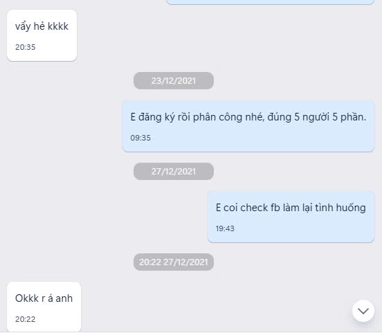 --Tụi bây chú ý ở đoạn tin nhắn ngày 23/12/2021 là lần cuối tụi tao nhắn tin với nhau, tức là đó là lần cuối tụi tao làm chung nhóm, tin nhắn lúc đó là đại khái phân công công việc làm nhóm thôi, chẳng có gì đặc biệt. Như vậy, từ lúc chỉ nói chuyện xoay quanh công việc, học tập, bây giờ tao sẽ chuyển sang nói chuyện riêng tư hơn, nói về đời sống cá nhân của tao hoặc nó để từ từ láy câu chuyện qua yêu đương. Hãy nhớ là, về việc nói chuyện về chủ đề cá nhân, tình cảm, đời sống thì thật sự tụi đực rựa không bằng tụi con gái đâu, nói về chính trị, quân sự chém gió ta bà thì bọn con trai còn sáng sủa, còn nói chuyện về chủ đề cá nhân, tình cảm, đời sống thì còn lâu mới bằng tụi con gái. Lúc này thì tao vẫn chưa xác định được là ẻm có người yêu chưa? Tất cả đều là ném đá dò đường, và khi hai đứa chưa thân thiết với nhau lắm thì đừng bao giờ hỏi "em có người yêu chưa?" vì tao cảm thấy rằng, nếu mà tán gái chưa gì đã nói ra câu đó thì nó đã biết tỏng ý định của mình rồi, theo bản năng tự nhiên, con gái sẽ đề phòng. Nên là hãy đợi 2 đứa thân với nhau hơn rồi hãy hỏi câu: "em có người yêu chưa?" vì đó là cách trực tiếp nhứt để biết được nó còn độc thân không, và khi 2 đứa thân với nhau rồi, hỏi câu đó sẽ thành một câu vừa vô hại, vừa có nghĩa là đùa.
