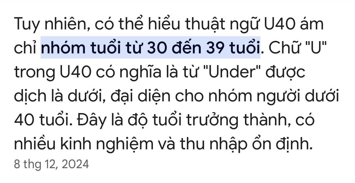 thằng ngu à . u40 từ 30-39 tuổi . ngu còn hay nói91 thì u30. U30 tính từ 30-39! Chả lẽ mày tính U40??