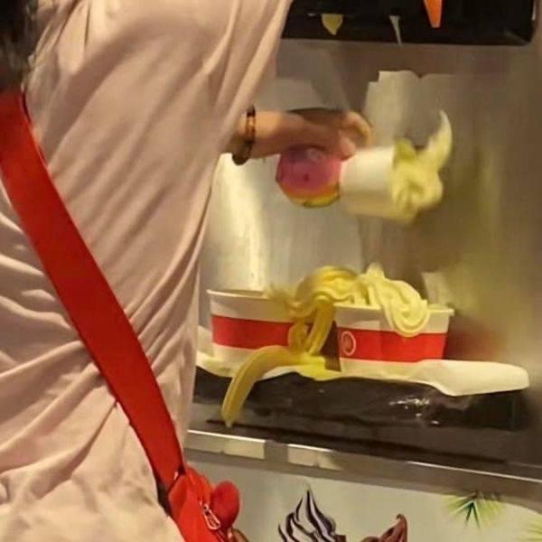 Chúng phụt kem ra cốc, đầy là bỏ, chọn cốc bé hơn thì cầm không chắc lại rơi, xong để đó và quay đi. Bạn nhân viên tới dọn, 1 bạn nhân viên khác thì tới nhắc nhẹ nhàng "Các con ơi mình không ăn thì đừng lấy kem như thế này nha".