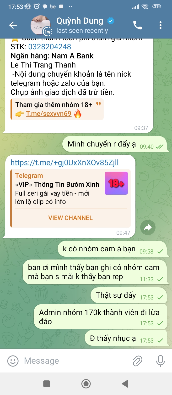 Cay quá đcm bọn m ạ sau bao ngày xem chùa t quyết định vào nhóm vip của "tình 1 đêm" thì l mẹ nó bị chơi một vố. Nó ghi rõ là có nhóm cam thi mua xog h đc gửi đúng 1 link vào cái nhóm có tầm trăm mấ ảnh đi lấy từ nguồn khác về. Địt mẹ đúng đời 200k 1 bài học