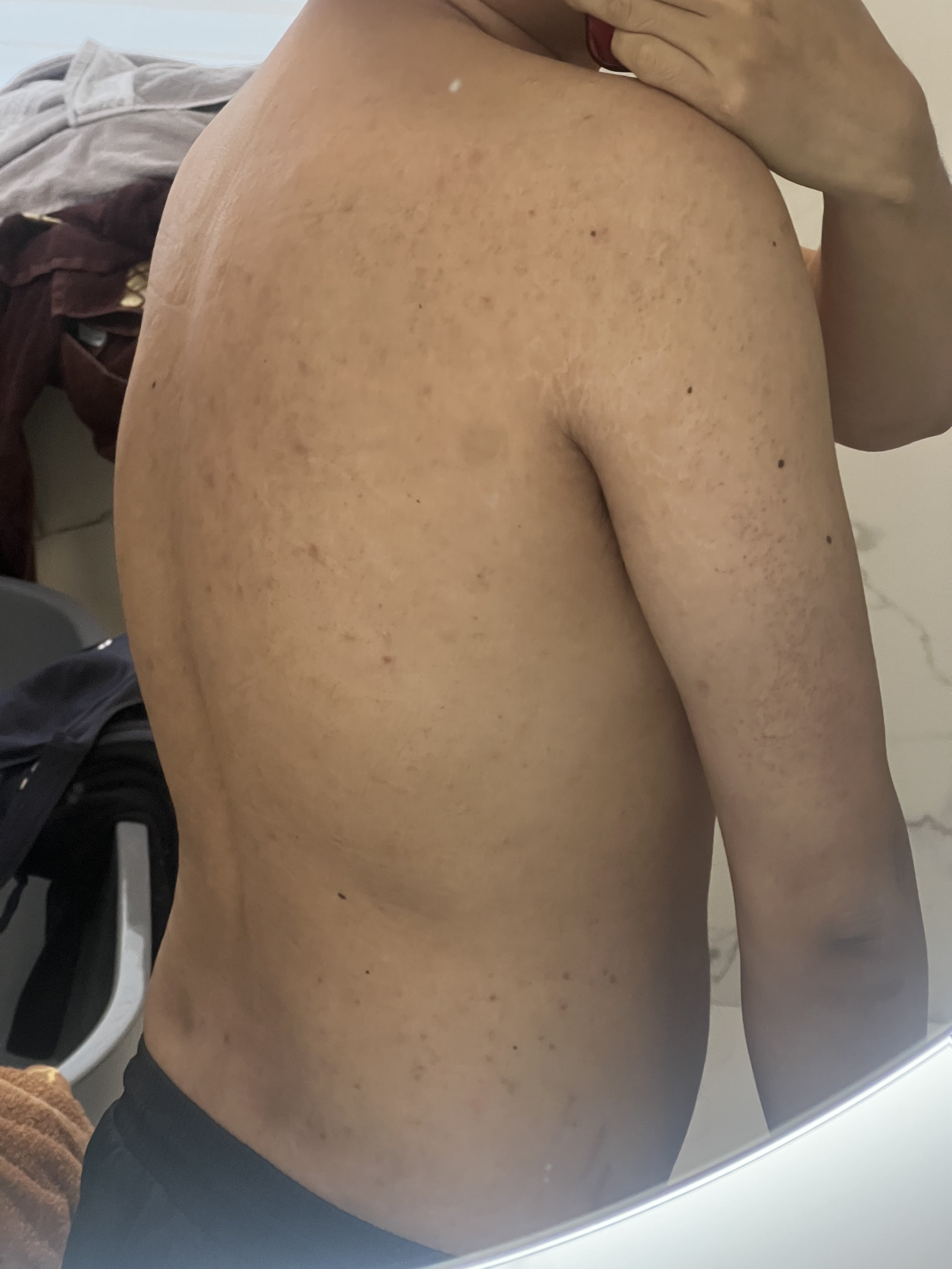Oke thanks m, bố t cũng bị ở cánh tay, y hệt viêm nang lôngPhần lưng có vị trí bị viêm nang lông, còn phần bắp tay thì t ko rõ. Mua dây chà lưng hay bàn chải chà lưng tắm cho sạch.