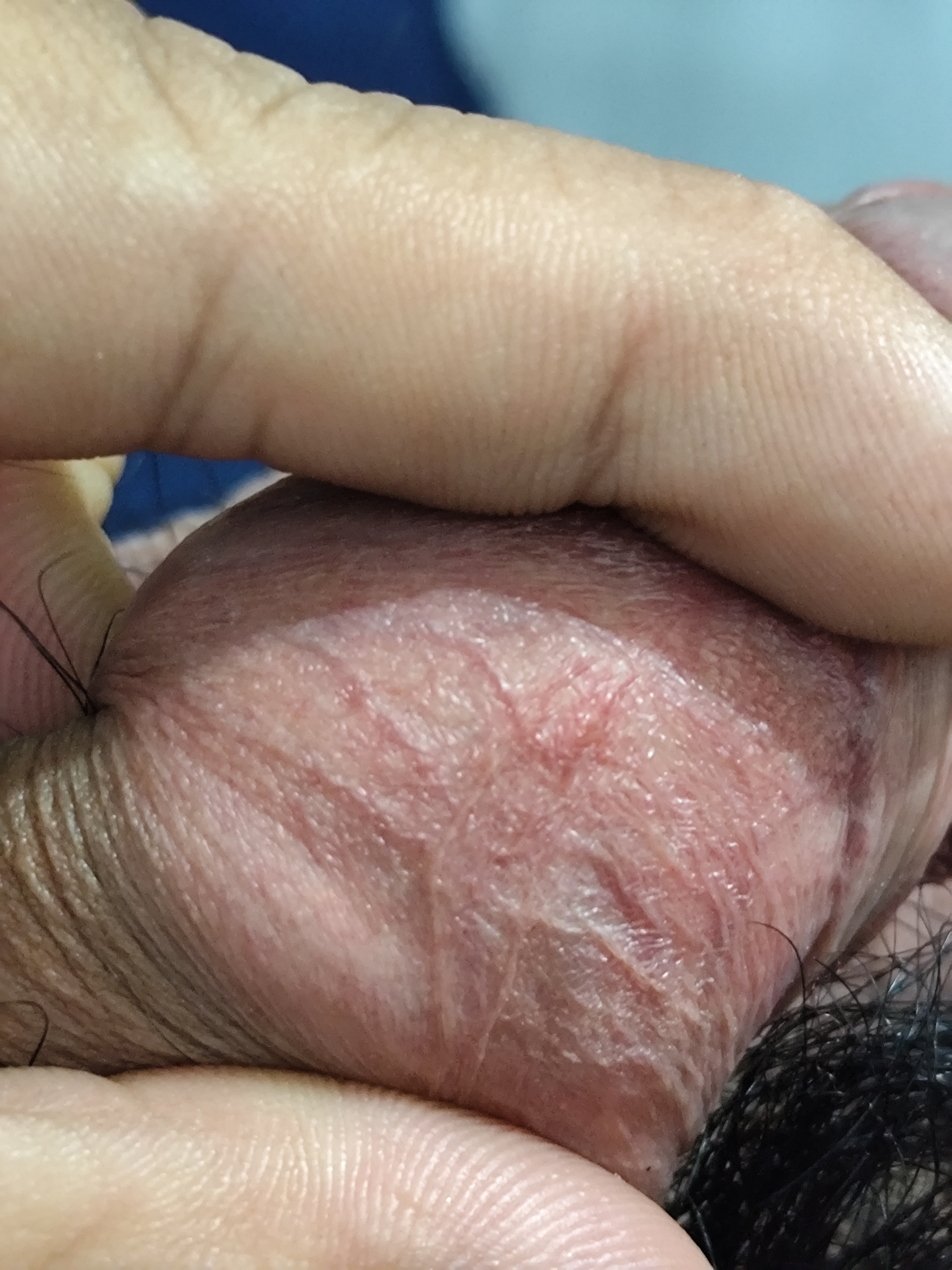 Các bac xem giúp e bị gì nó ửng đỏ lên nốt liti hơn tháng r nằm im đó k hết ạ k rát ngứa gì cũng k lan to ra .em chụp lúc tuột bqdd xuống và lúc kéo bqdd lên các bác xem giúp ạ