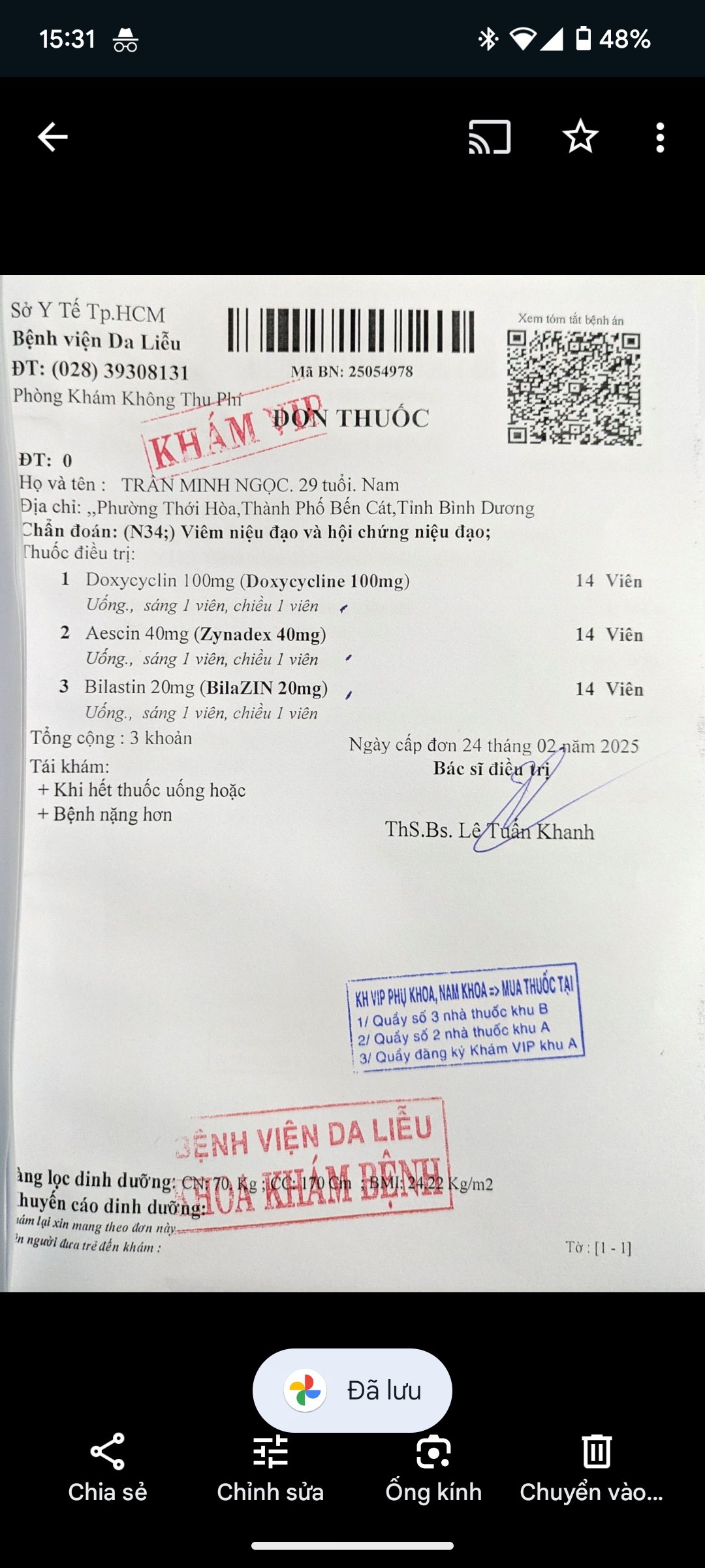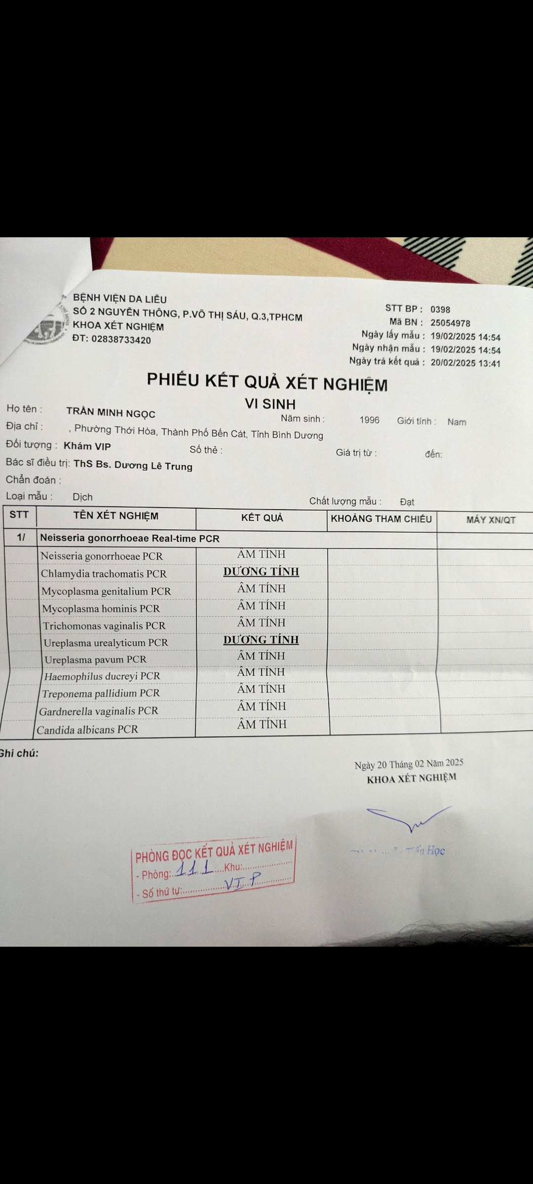 Tình hình là mình có xét nghiệm da liễu lần đầu chỉ thấy vi khuẩn => viên đường tiết niệu cho thuốc 7 ngày k hết nên sét nghiệm pcr kết quả dính chlamydia cho tiếp 7 ngày thuốc tiếp nhưng hiện giờ đã hết thuốc, lúc sáng mình thức dậy có kéo dọc dương vật thì có 1 ít dịch, rất ít k thấy rỏ k biết là do lúc sáng nắng cục tiết dịch nữa, hôm qua có tiểu rắt nhưng hôm nay thì hết, dưới đây là toa thuốc k biết thuốc này hiệu quả cao k nữa, đang định xem tình hình vài hôm nữa k ổn thì tái khám, do thằng Chlamydia này triệu chứng k rỏ ràng như lậu nên củng ớn