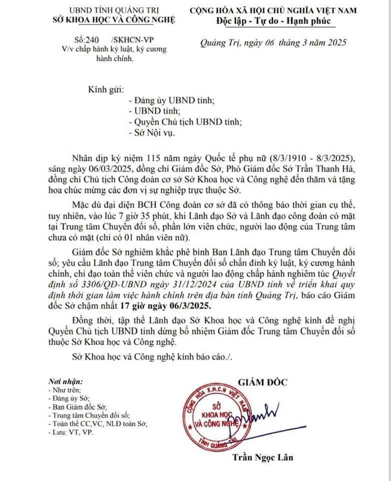 Cũng tại văn bản này, Giám đốc Sở KHCN tỉnh Quảng Trị nghiêm khắc phê bình ban lãnh đạo Trung tâm Chuyển đổi số, yêu cầu chấn chỉnh kỷ luật, kỷ cương hành chính, chỉ đạo toàn thể viên chức và người lao động chấp hành nghiêm túc quy định thời gian làm việc hành chính của UBND tỉnh Quảng Trị.