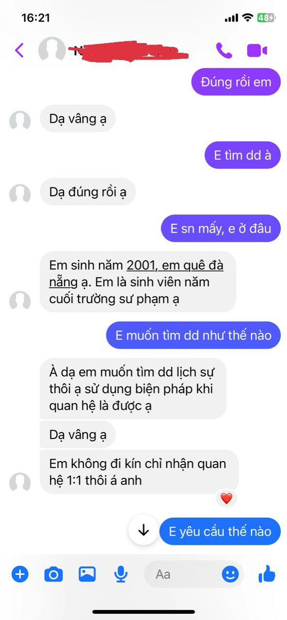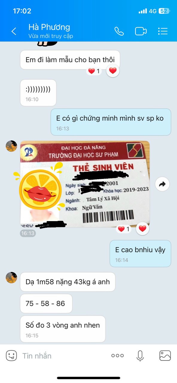 Vừa mới gặp đc bé sgbb 2k1 sv sư phạm nhưng ko hợp gu tao lắm, nó muốn tìm 1 dd quen 1:1 chu cấp 10tr/ 1 tháng gặp 5,6 lần. Nó cao 1m58, 43kg, số đo 3 vòng 75 - 58 - 86 , theo đánh giá tao thì bé nó mặt mũi bt, dzú lép, nhìn mặt có vẻ dâm, ko đáng số tiền 10tr, còn thằng nào gu lạ hay nhiều tiền muốn nuôi thì ib tao cho số kết nối nó.