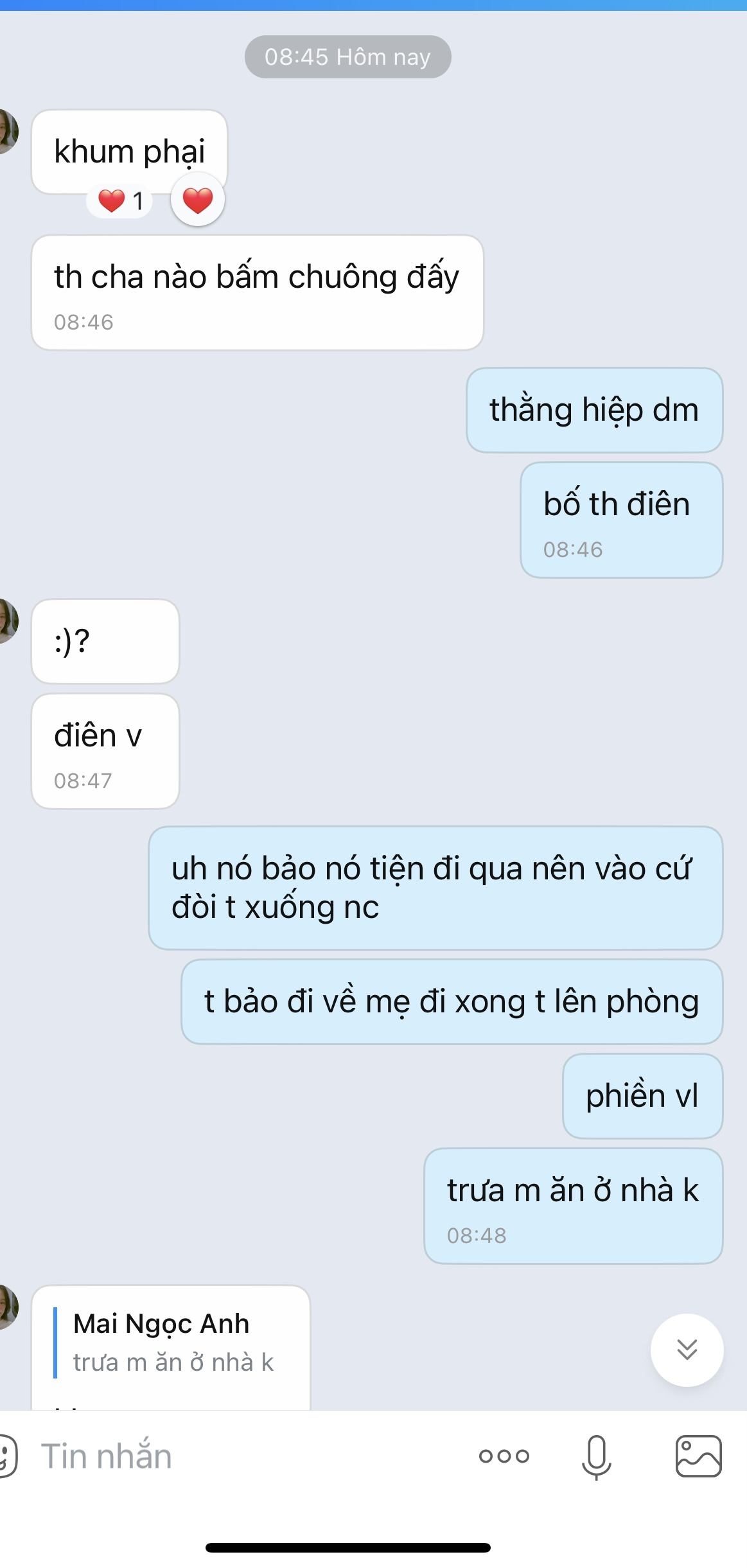 vcl khó thế mà m cũng nghĩ ra đc. Tin nhắn từ 8:40 đến h m nói tao mới chụp gửi vào gr cho mọi người kiểm chứng chứ tin nhắn mới tạo L đâu. Đéo như m lắm zalo lắm nick clone vào xạo L nên nghĩ ai cũng như m ý, chính mẹ m làm phò chứ ai mà m chửi ng khác. tao đăng ảnh mặt tao đấy, m giỏi up mẹ mặt m lên đây đi t xem :))) mình nói đúng thì ngại Lìn gì