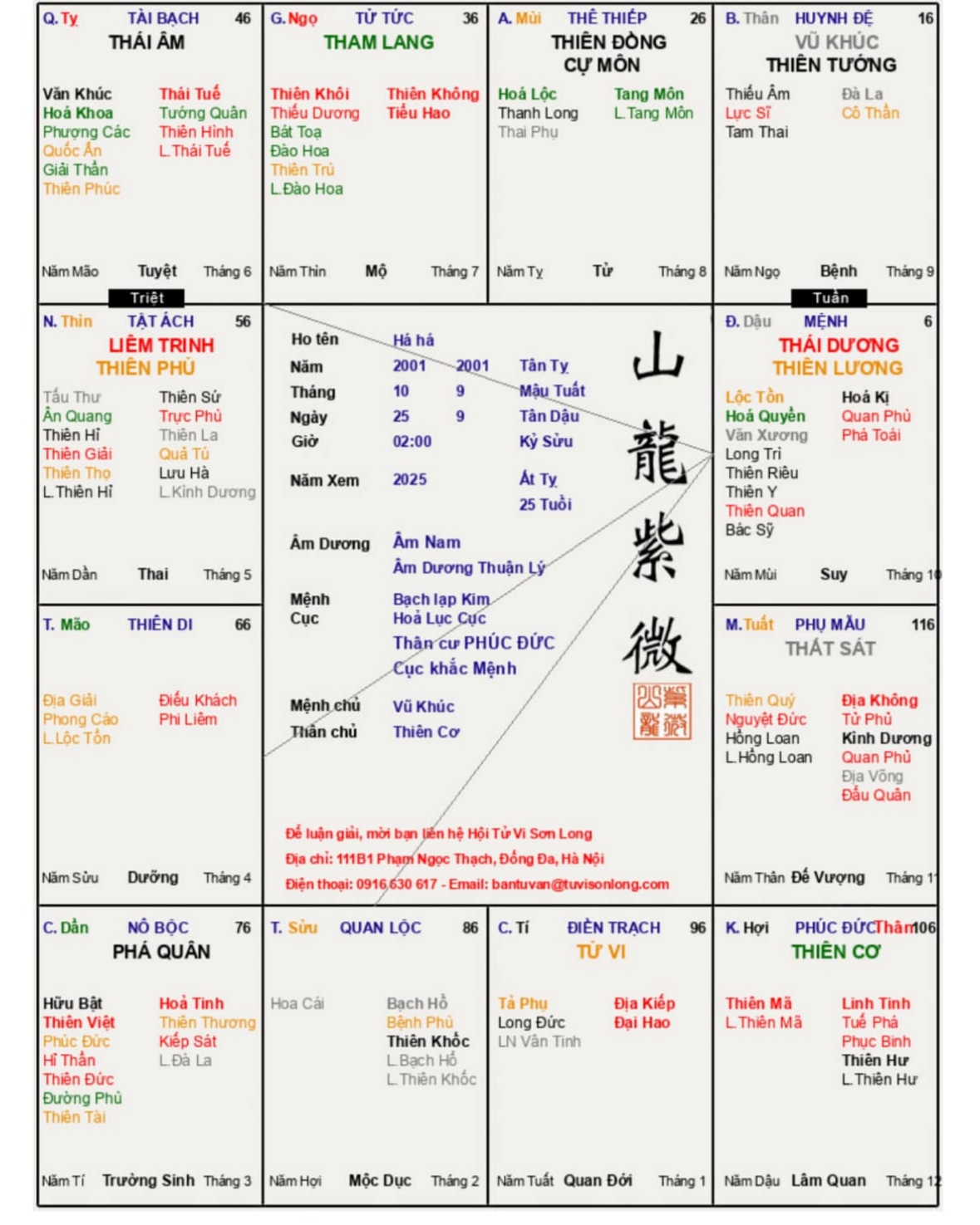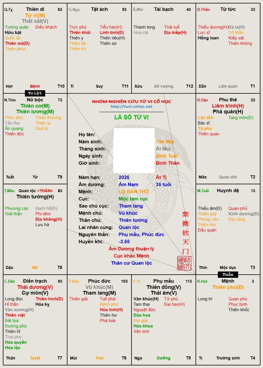 Không ai ở đây là thầy tử vi cả, ranh thì mình ngó giúp. Lá số bạn là mã khốc khách, ngựa trạng nguyên nên đi làm ăn xa thì ok lắm, nhưng rất mệt đó, vợ có.địa vị trong xã hội, rất ghen sau bạn đông con, gái nhiều hơn trai. Cẩn thận bệnh về mắt, mổ xẻ và huyết áp.