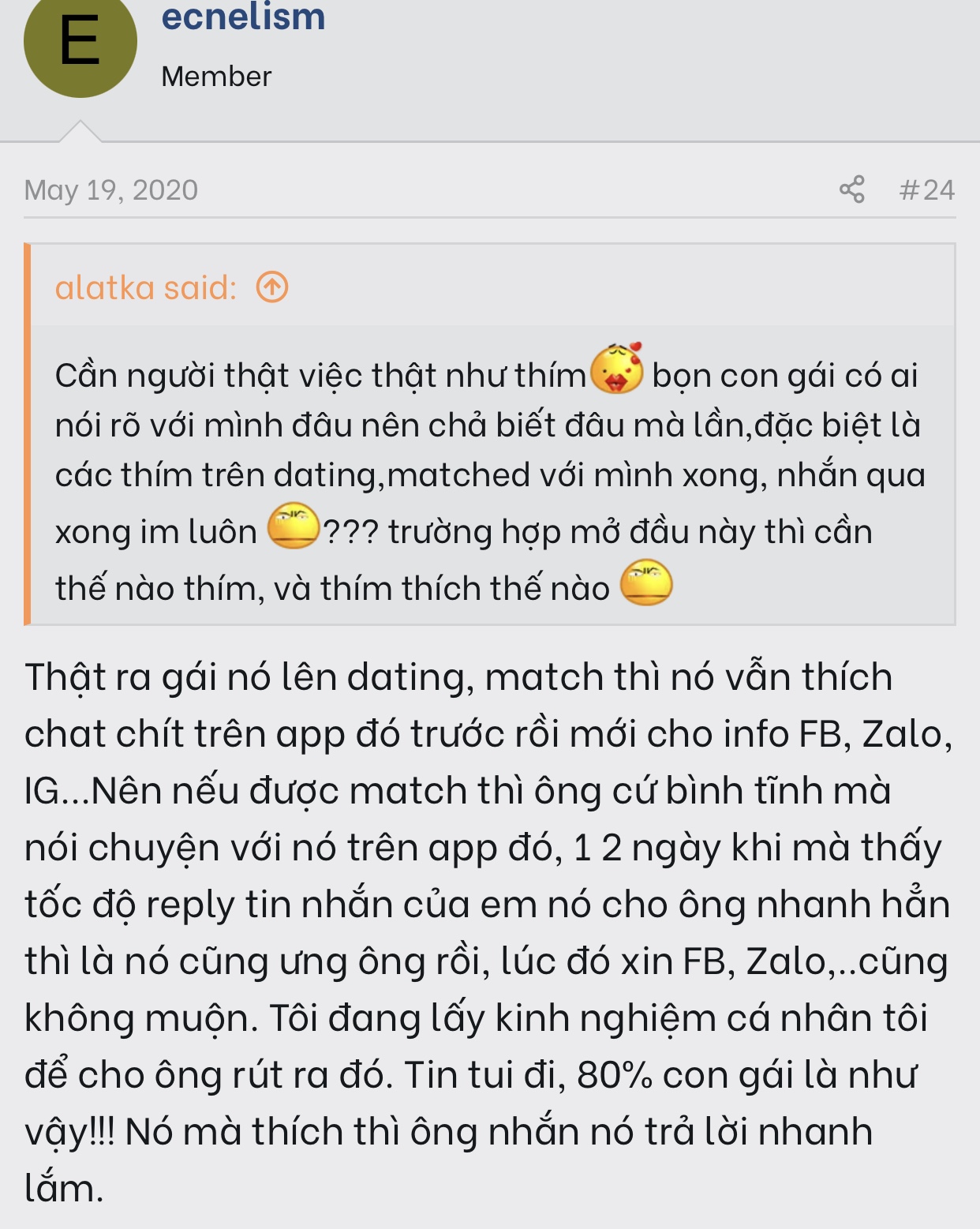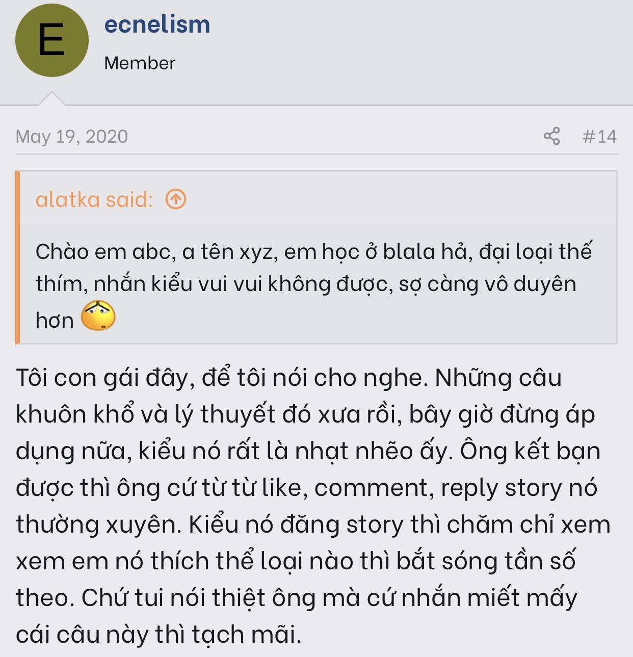 Bởi vậy nếu nói theo kiểu dẫn dắt và alpha cũng không hẳn tốt. Đôi khi văn vẻ và như “anh rất là muốn em đó” vậy lại tiến được.