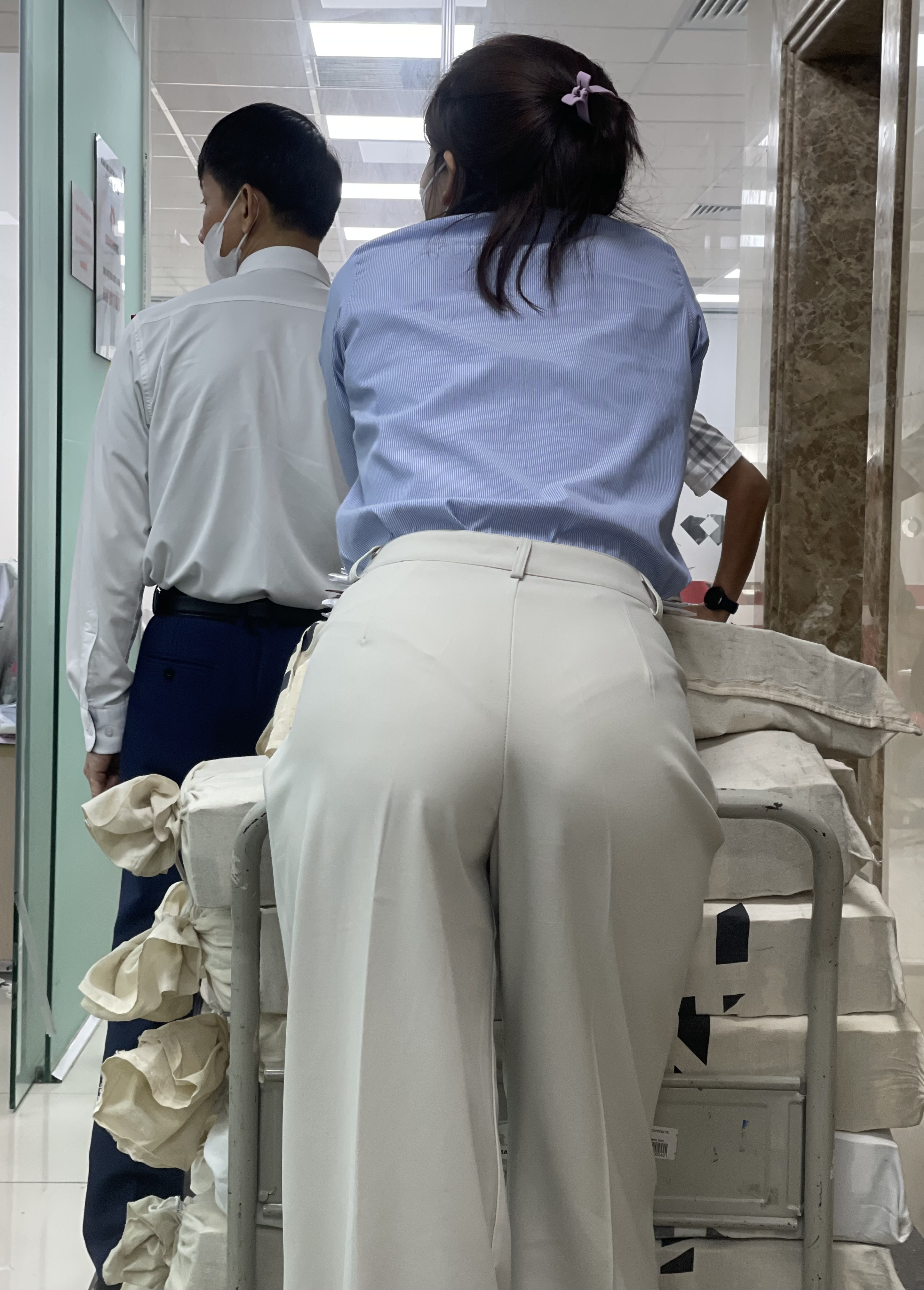 bọn gái vp giờ nhiều đứa chuộng cái áo kẻ xanh này nhỉ, vp t cũng có mấy con, mặc cái quần sơ mi bóp eo nữa, nhìn mông cong nhỉ muốn nhét cặc vào