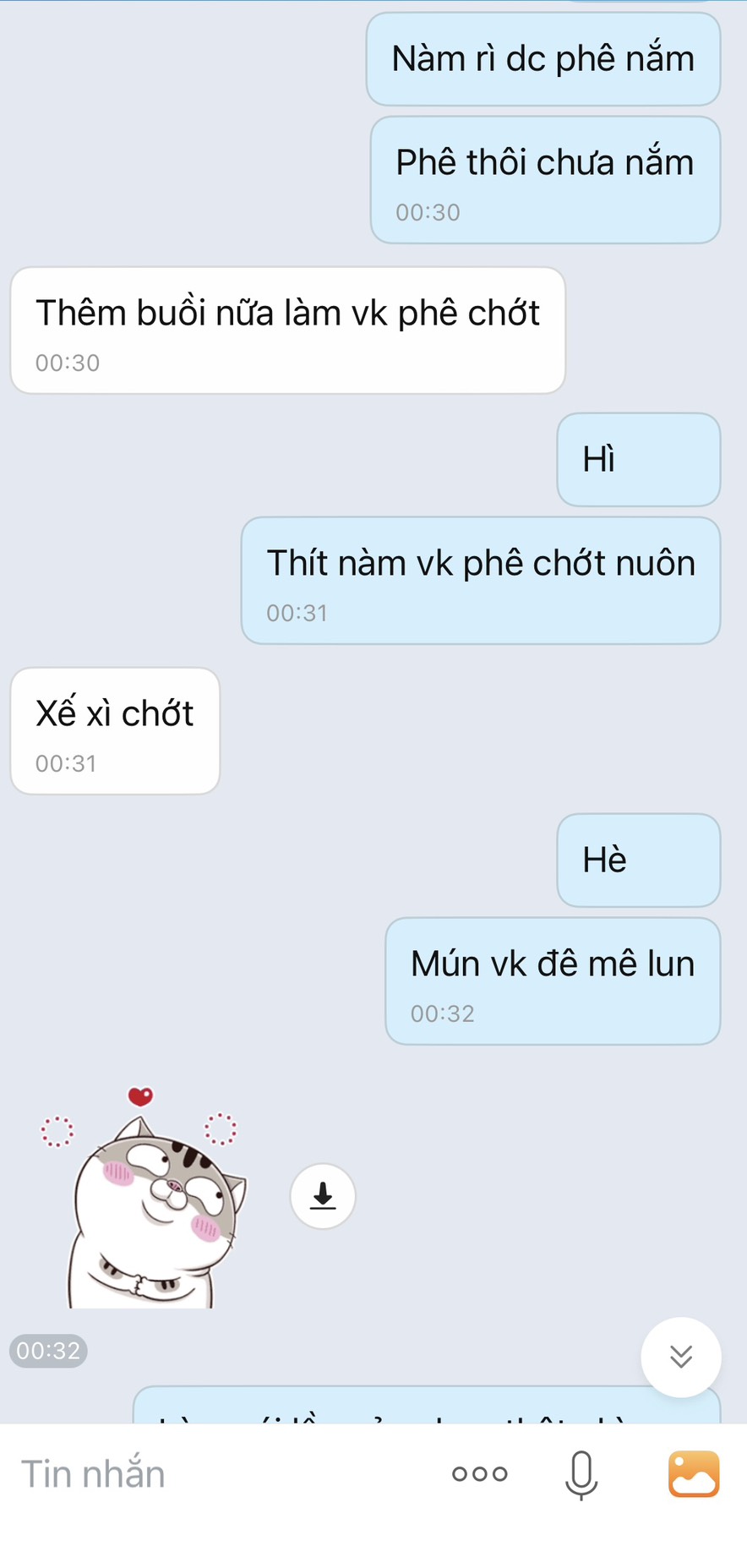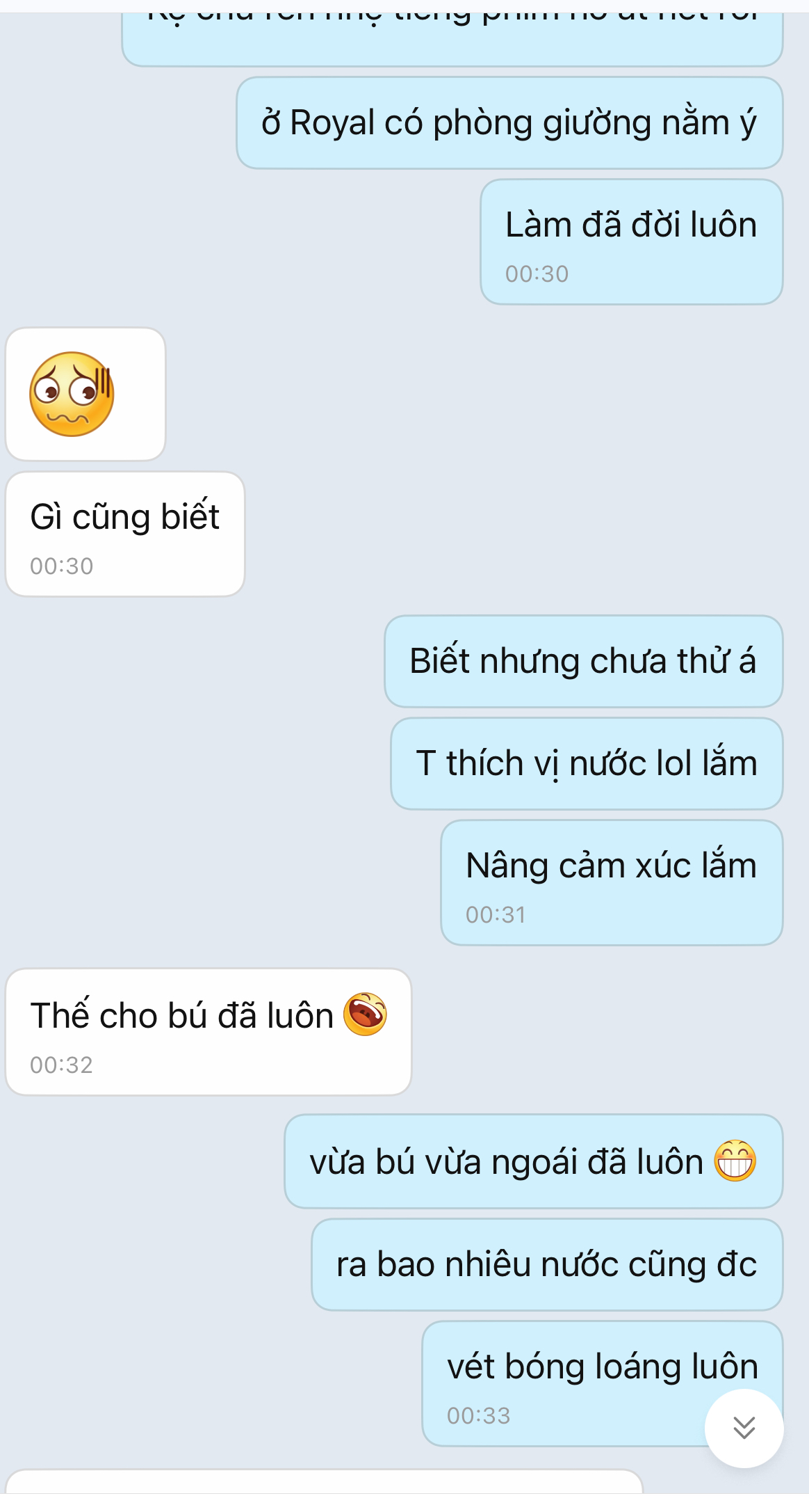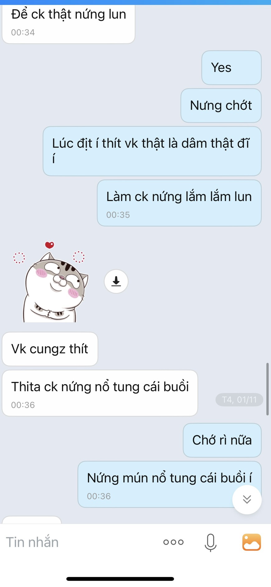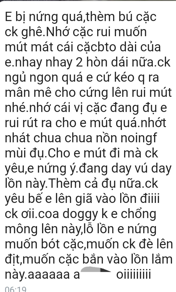 Dm. t lục tin nhắn cũ thằng này chuyên đòi hình đùi, đýt, zú với cứ hẹn gặp nhưng chưa có cơ hội . Hôm 30/4 nó đòi gửi hình đùi qua ( ko mặc quần ) nhưng lúc đấy khuya nên ko tiện gửi, hẹn qua hsau gửi thì bị mẹ nó bắt về nên ko kịp :)))))