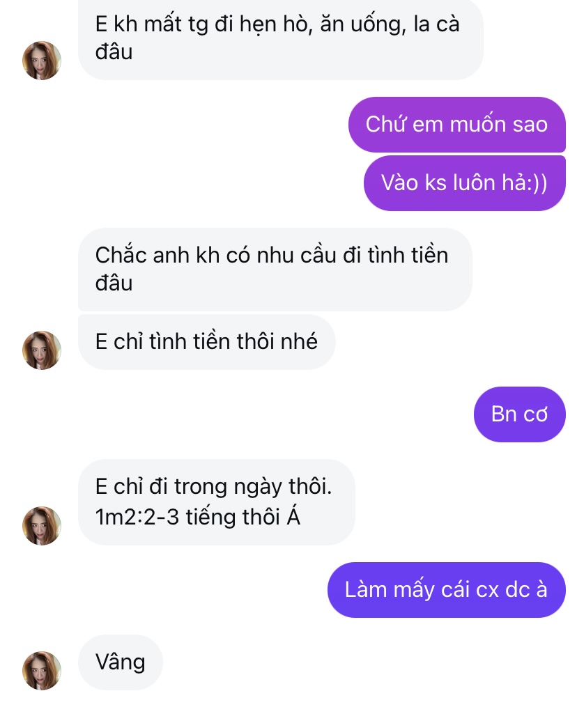 Thế chắc là mới biết làm tiền rồi. T cf thôi chứ t cũng đoán -70% ảnh rồi, đen, gầy lắm lông t xem ảnh cũng thấy thếVcl, con này bọn m -80% ảnh nhé, lùn, gầy,lép, đen với mụn. Con này trc t 0 note, đ mất đồng nào. Ăn đc 1 lần t sợ chạy mất dép