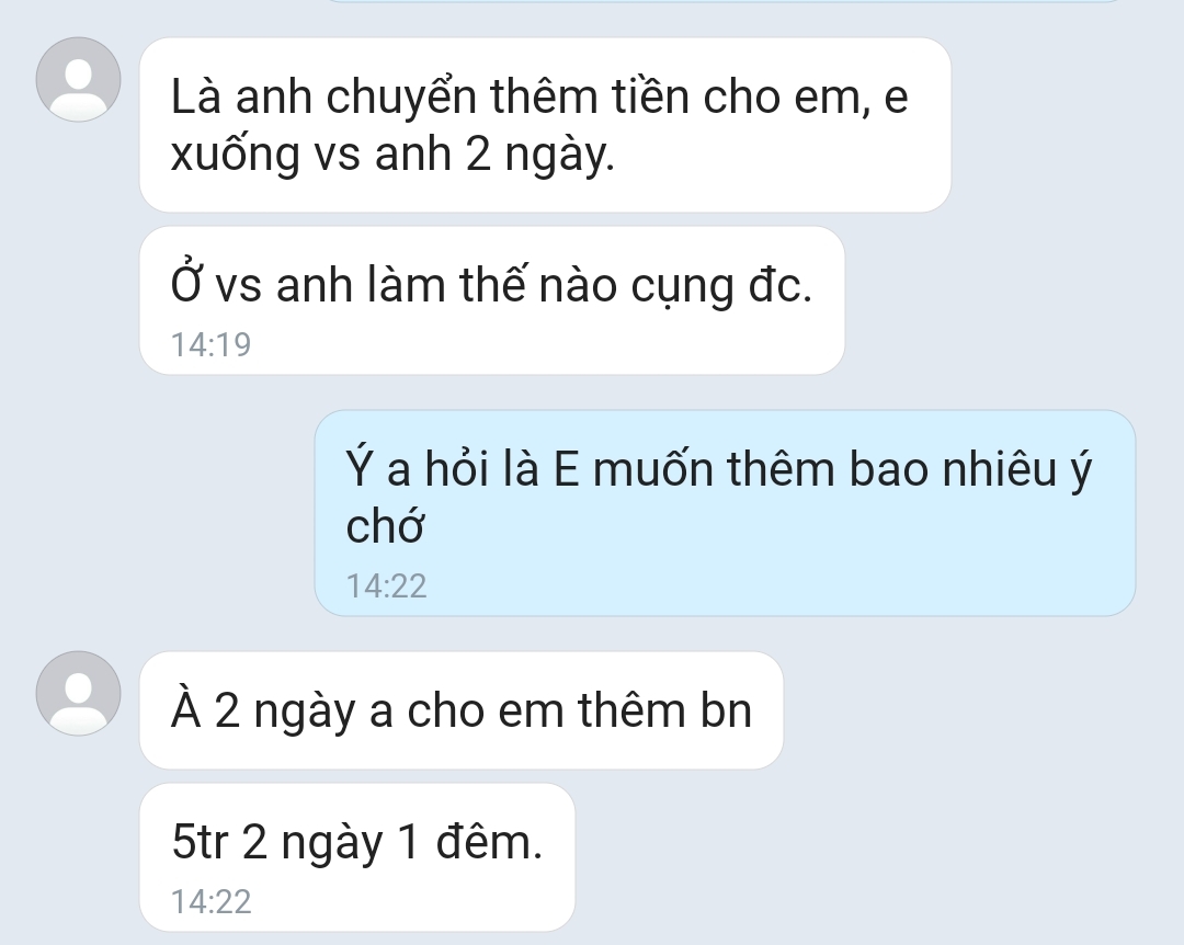quên mẹ nó đi, mày bảo đón hoặc gọi xe cho nó, nhưng 5 củ 2 ngày thì kiểu gì cũng là mày lỗ, tự cân nhắc nhéAe từ từ, e này t ko biết có phải lừa đảo như ae ns hay ko vì đang nc chưa gặp, còn cái chuyển tiền trc là do e nó còn là hs nên bảo t chuyển tiền di chuyển vì e nó sạch tiền, ko còn tiền xuống (theo lời nó) còn nếu t xuống tận nơi đón nó thì ko cần chuyển trc nhé