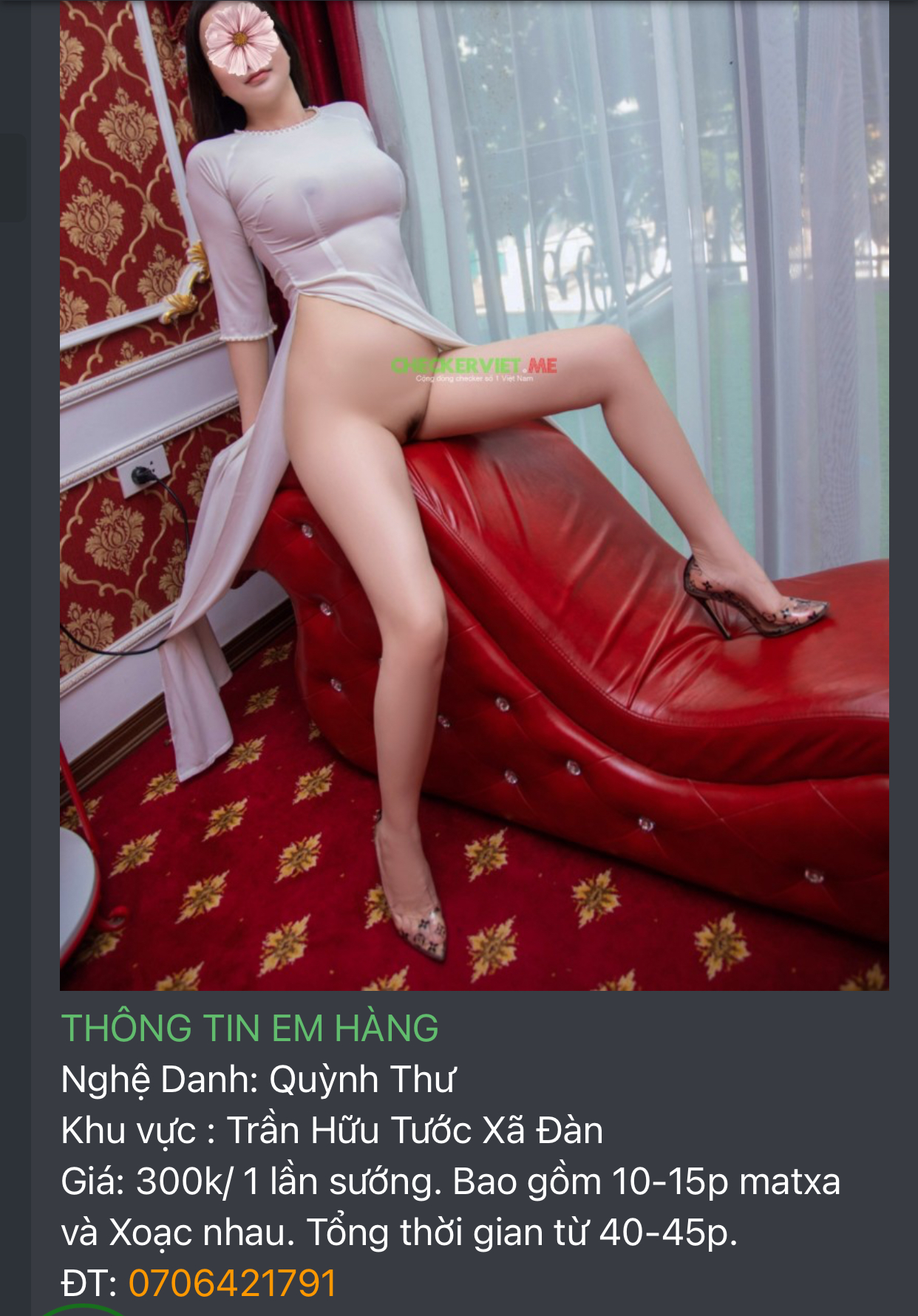 Có Hôn hít cháo lưỡi gì không hả béChị này tôi chơi 2 lần rồi, hồi còn 96 trần hữu tước; dáng dấp, dịch vụ đều ok đó