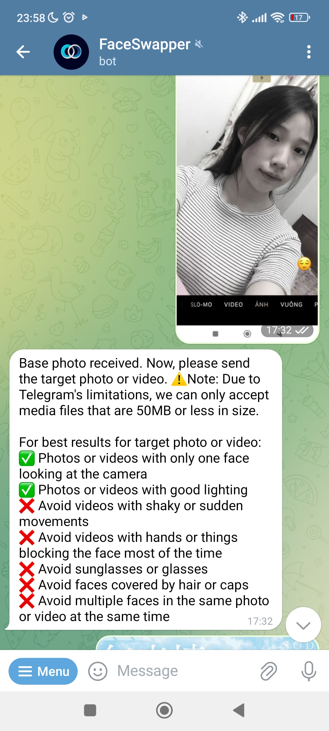 B2: nó gửi thông báo ảnh basic, rồi gửi tiếp cái vid hoặc ảnh cần gắn face vào