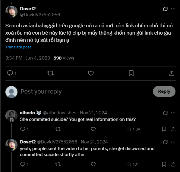 nghe bảo gđ cho sang nước ngoàiCon này cũng học giỏi có đầu óc mà đăng cả mặt lên reddit nên bị lộ ko có tự sát gì đâu. Chẳng qua e nó nổi quá nên không đăng tải gì lên mxh nữa. cũng đầy người dùng social mà có đăng gì đâu. Em nó chỉ sống ẩn thôi, t cũng tò mò e này với huong hana e này t thì gần 5 năm rồi còn huong hana thì cũng hơn 10 năm. Nói chung chắc 10 năm hoặc lúc nó u30 hoặc ko bao giờ nó đăng gì lên social nữa