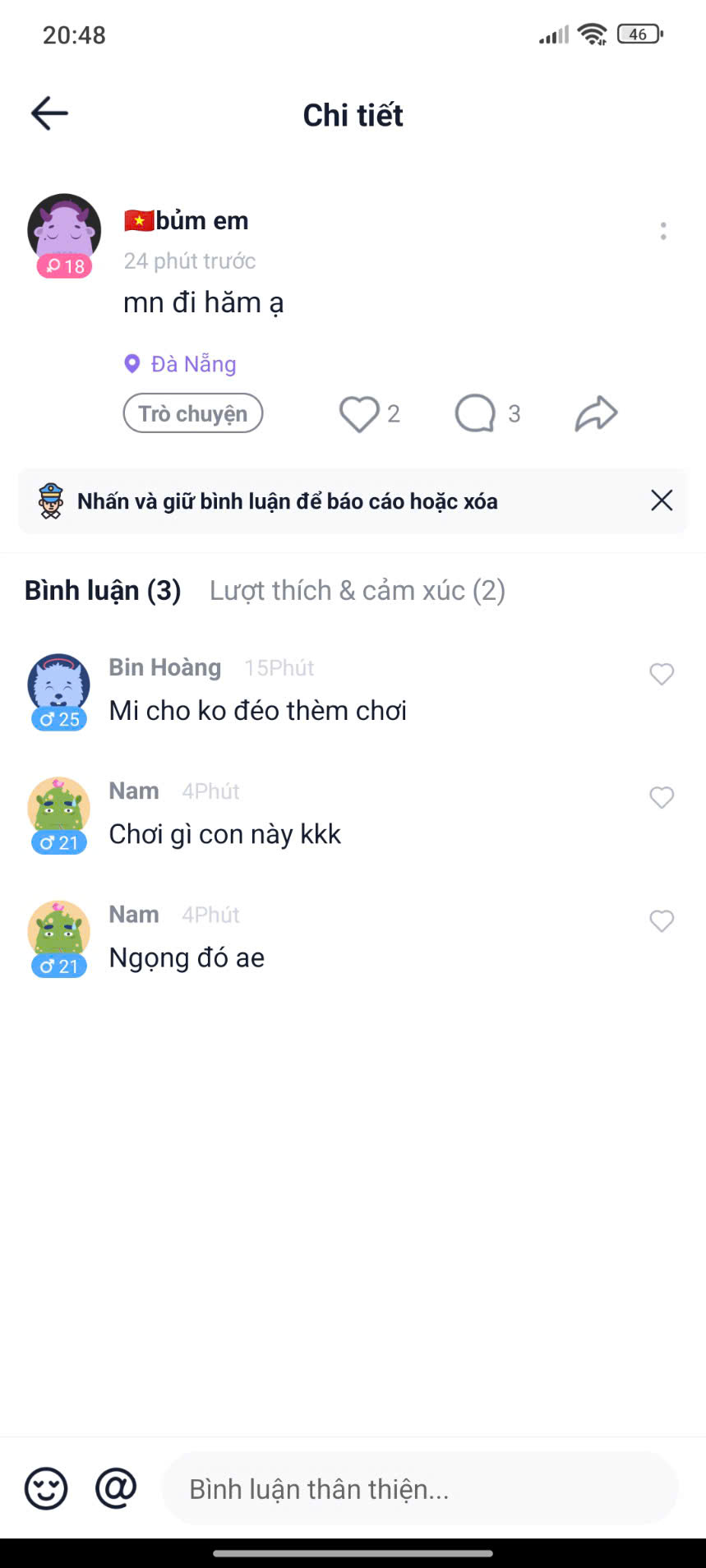 Ai biểu mài chơi! Vô thấy bỏ về mẹ rđm về mữa luôn , mé , tắm 2 gói dầu gội, xài 2 lần dung dịch vệ sinh nam . tởm vcl ..