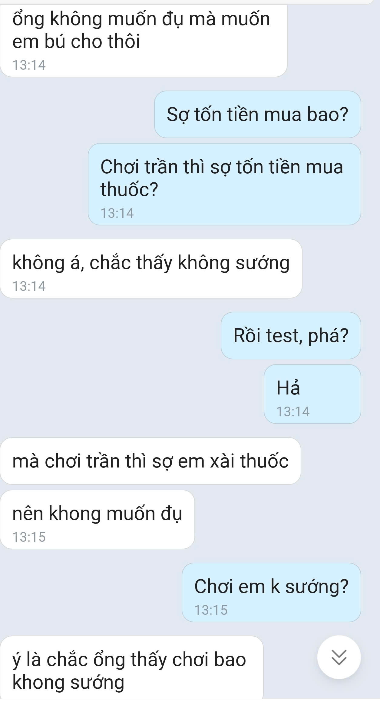 gái mới lớn nên yêu đương còn màu hồng lắm. Gặp thằng vừa nghèo vừa hèn, đòi yêu múi mít thơm phức, đến tiền trả ks còn muốn con bé trả cho. T đang thao túng để con bé ghét thằng bồ, cho t độc chiếm cả thể xác lẫn tâm hồn kkksau con em vợ có cưới thằng ny nó k nhỉ