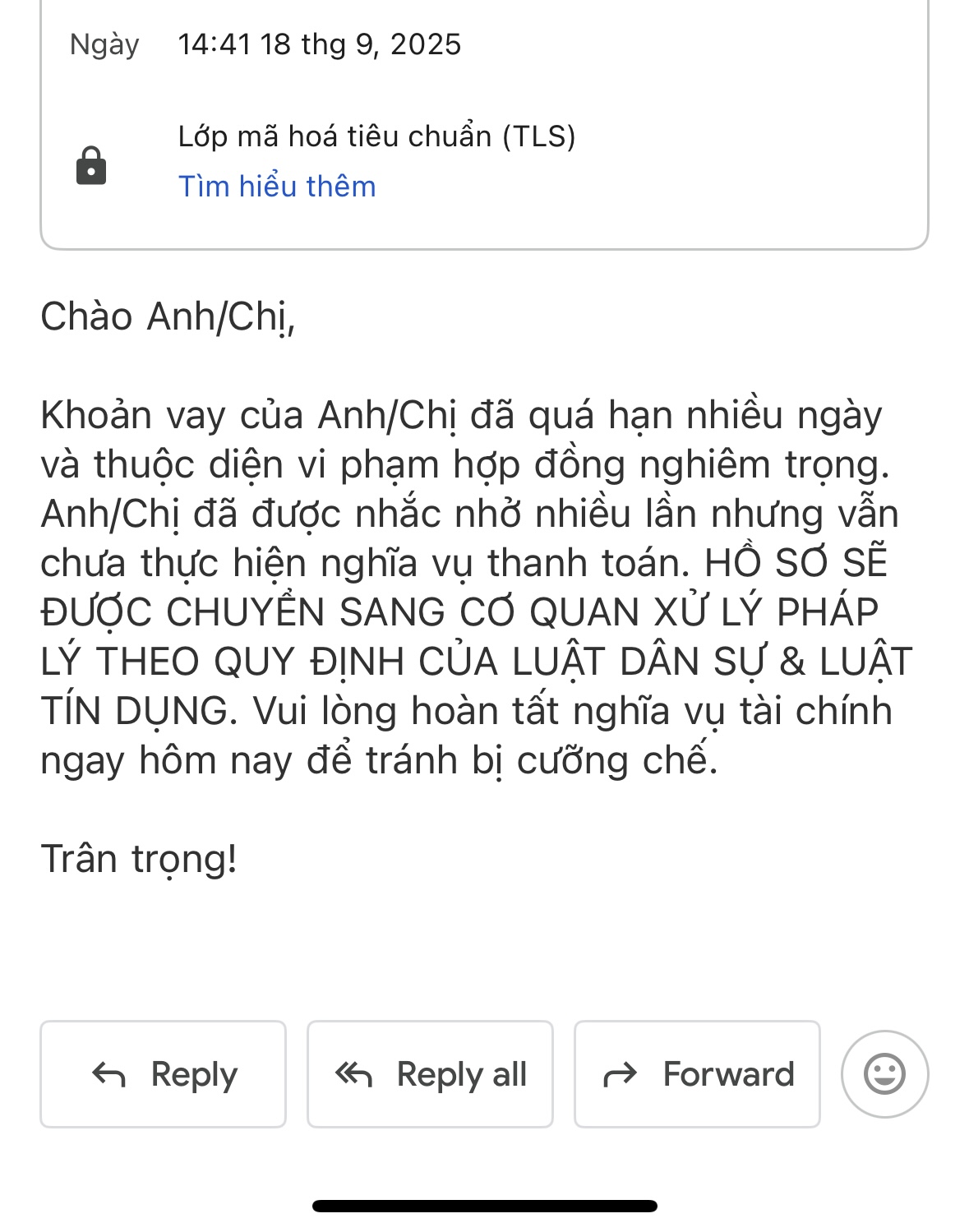 Chẳng là ngày 14 hàng tháng t đóng nhưng tháng này kẹt quá 18 tây r t chưa đóng thì nó gửi mail ntn thì sao hả tụi bây. Có bị dính về pháp luật thưa kiện gì ko . Mong ae có kn giải đáp giúp t