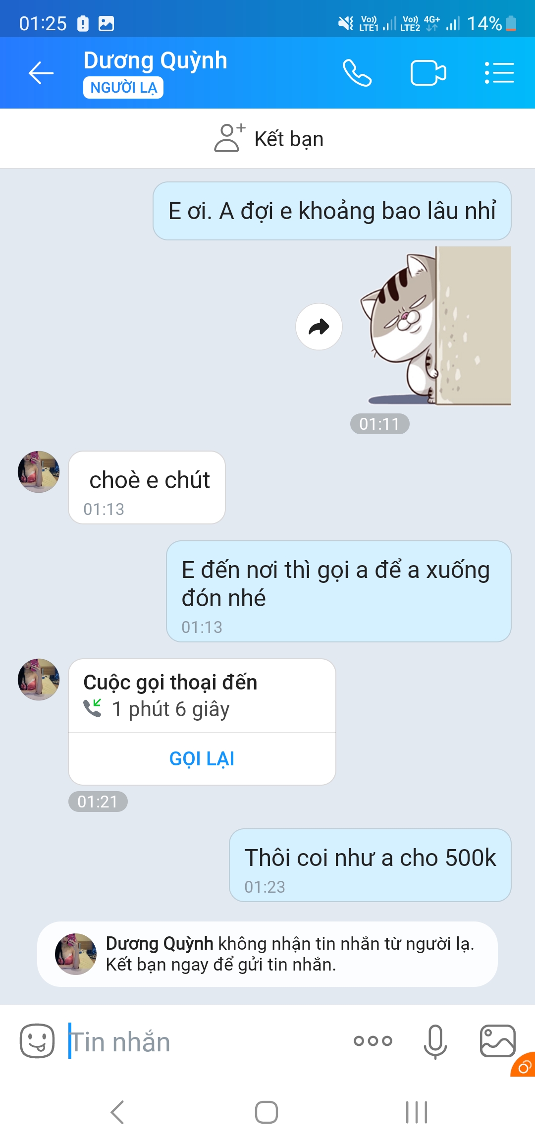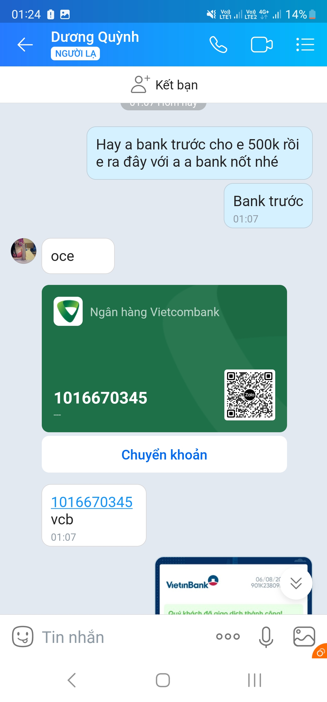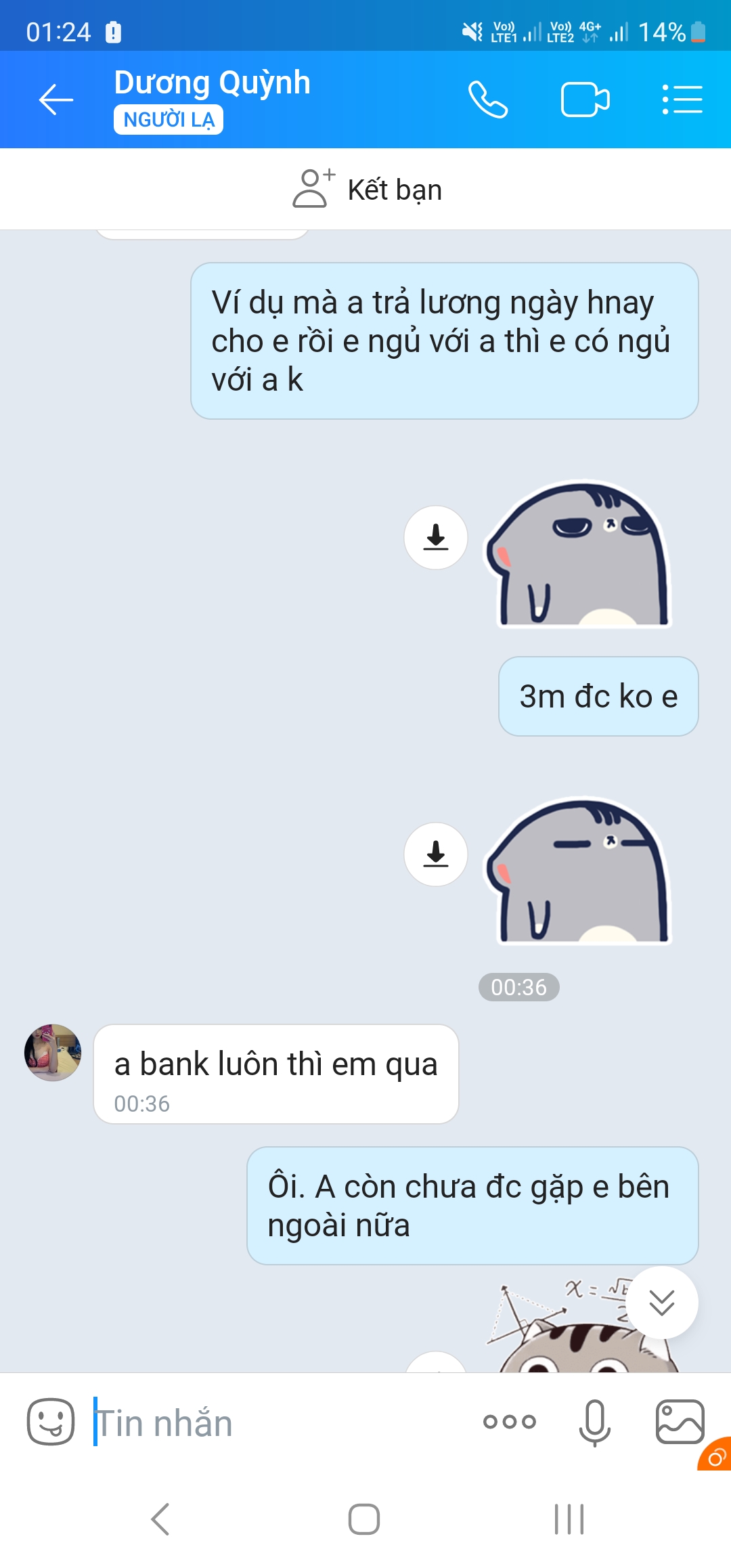 Đm. Tưởng được kèo thơm. Ai ngờ kèo thối vcl. Mình gạ đi chơi 3m. Nó oke xong đòi bank trước. Bank cho 500k cọc bảo ra bank nốt mà nó lại nhờ 1 thằng gọi điện dọa dẫm rồi chửi mình là m thích gạ gẫm người yêu t ko mới sợ chứ. Bts con booking hãm loz. Thí cho nó 5l nhưng mà thấy cay nên phốt cho ae biết.