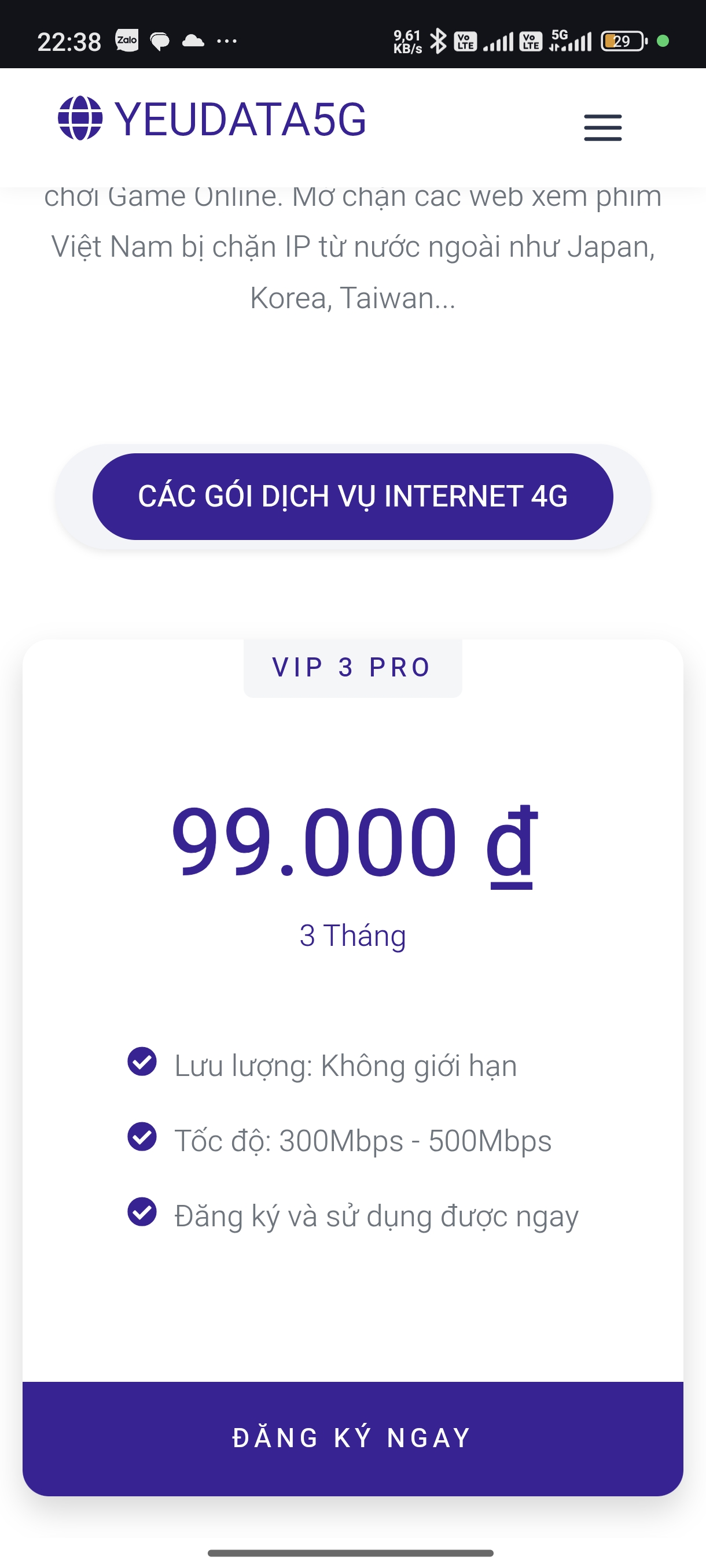 hachita88 đã viết: phải bật VPN liên tục hay sao đó, mà ping như cặc được mỗi cái tốc độ Nhấn để mở rộng... E có gói data 2gb rồi mà e đi làm lâu lâu hay bị hết. Tính đk để có gì bật lên cứu cháy chứ đk thêm data thấy hao quá