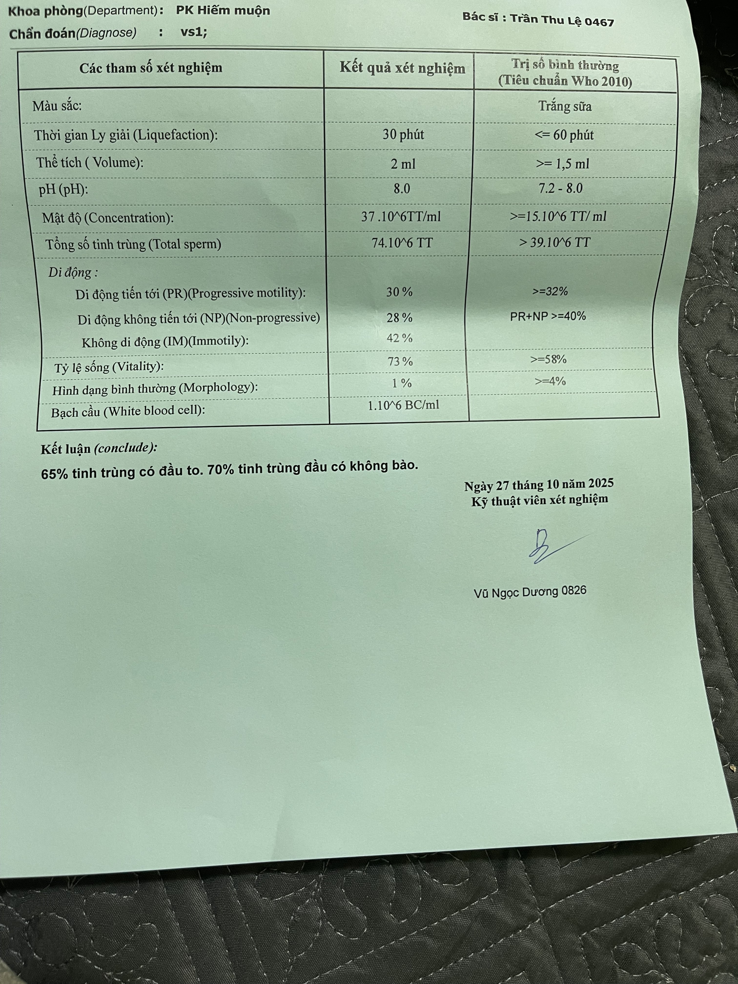 Thấy có mấy mục dưới mức bình thường chắc là nguyên nhân chính khó thụ thai