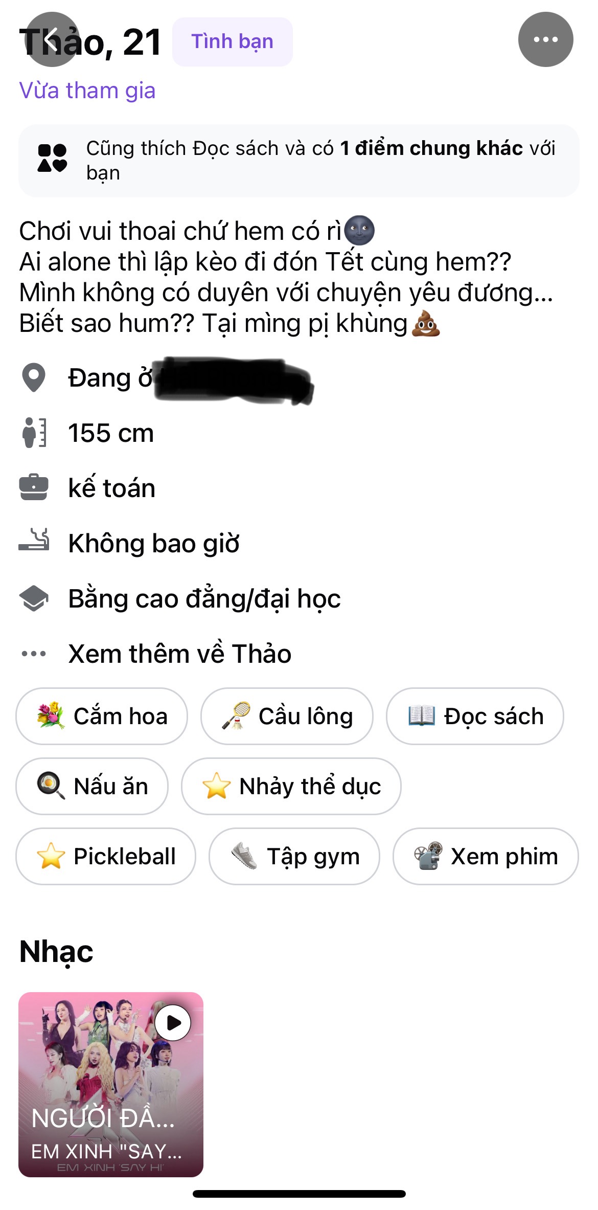 con này nó ghi vậy là dễ chén vl đấyVí dụ profile như này thì m mở lời nhắn như nào, làm mẫu hộ t phát, t match thì nhiều lắm mà k biết nhắn sao![]()