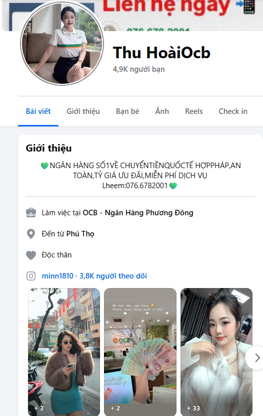 đéo gì mà phải mt fb sdt nó đấy cần đổi tiền hay gửi tiết kiệm thì alo nó, nó làm ocb cầu giấy, đợt tao có ngồi cafe vs nó rồi, nói chung theo cảm nhận của tao ko phải dạng tình tiền, còn thằng nào xơi dc thì tao chịu :))