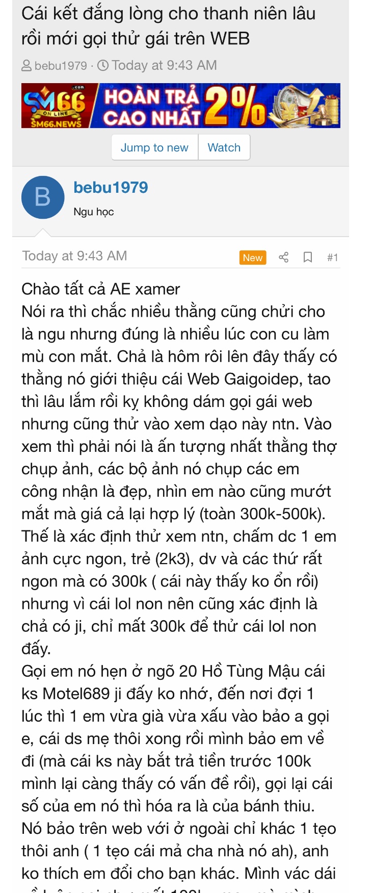 Một là mày bị điên không cũng gay, hai là em nó cá xấu, còn ko thì mày bợ đít nó. Bỏ thời gian ra mời em nó cf nói chuyện xong 2 đứa chào nhau về, xong lên đây xúi anh em xamer đi check, chán thanh niên quá!!Em này uy tín nhé chúng mày, hàng thật k lừa đảo. Ck con rồi, bị gài vào app kubet kéo nhóm nên sa cơ, tao check app rồi thua 170tr nhưng kéo lại dk 50tr xong sợ ko dám chơi nữa. Tao gặp cafe r, chưa check hang. Lang thang web nên biết nhóm nay mà đăng, Ai thích gái sa cơ thì check đi. Ko phải lừa đảo đâu nên chúng mày yên tâm. Em nó nói sợ gia đình biết nên k đưa sdt, tao động viên r đấy phần còn lại ở chúng mày.
