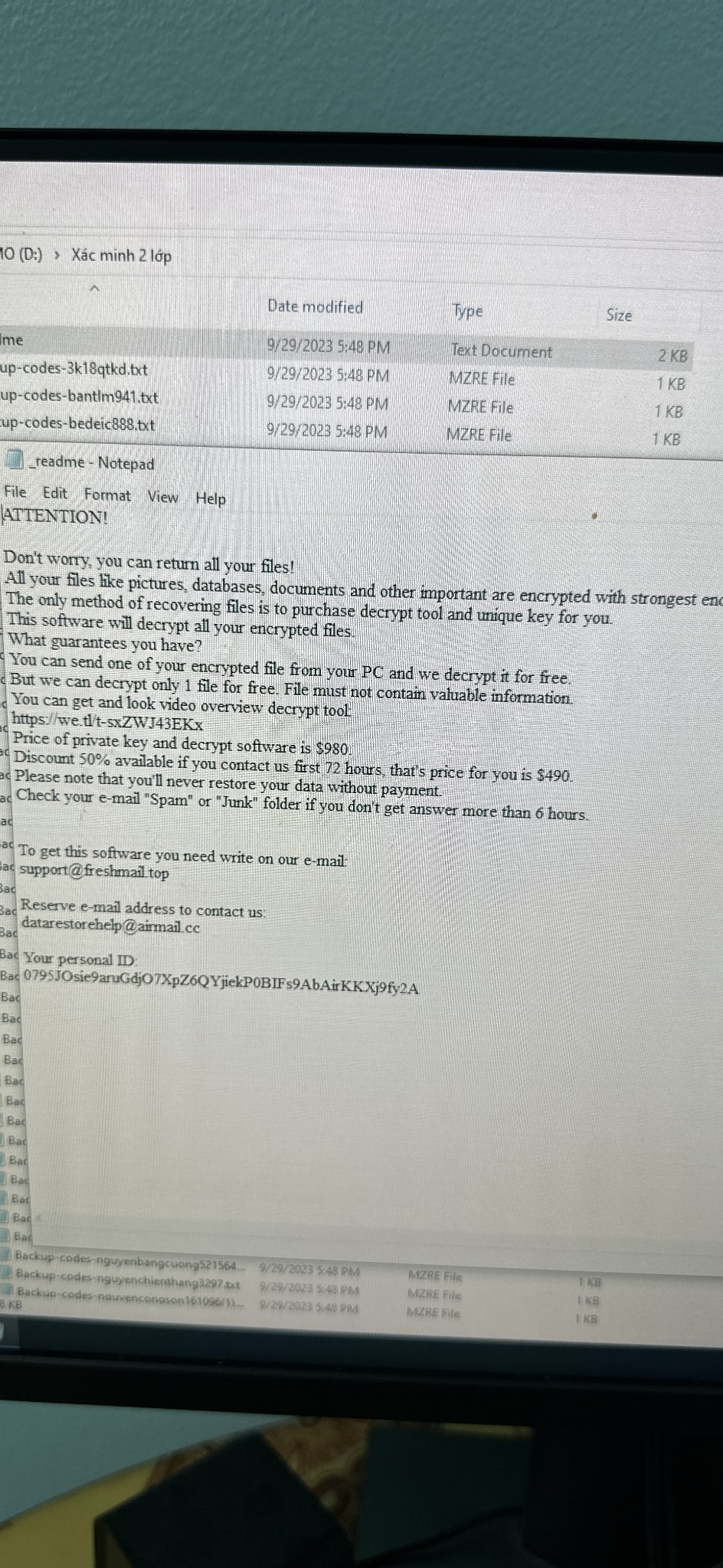 Cách đây 1 tháng tao cũng bị rồi! Mày đổi mk các tài khoản mày từng đăng nhập trên PC đi, nó hack được đấy! Tao chỉ khắc phục lại = cách cài lại máy thôi, chứ mấy file tài liệu nó mã hoá hết cả rồi! K cứu đc