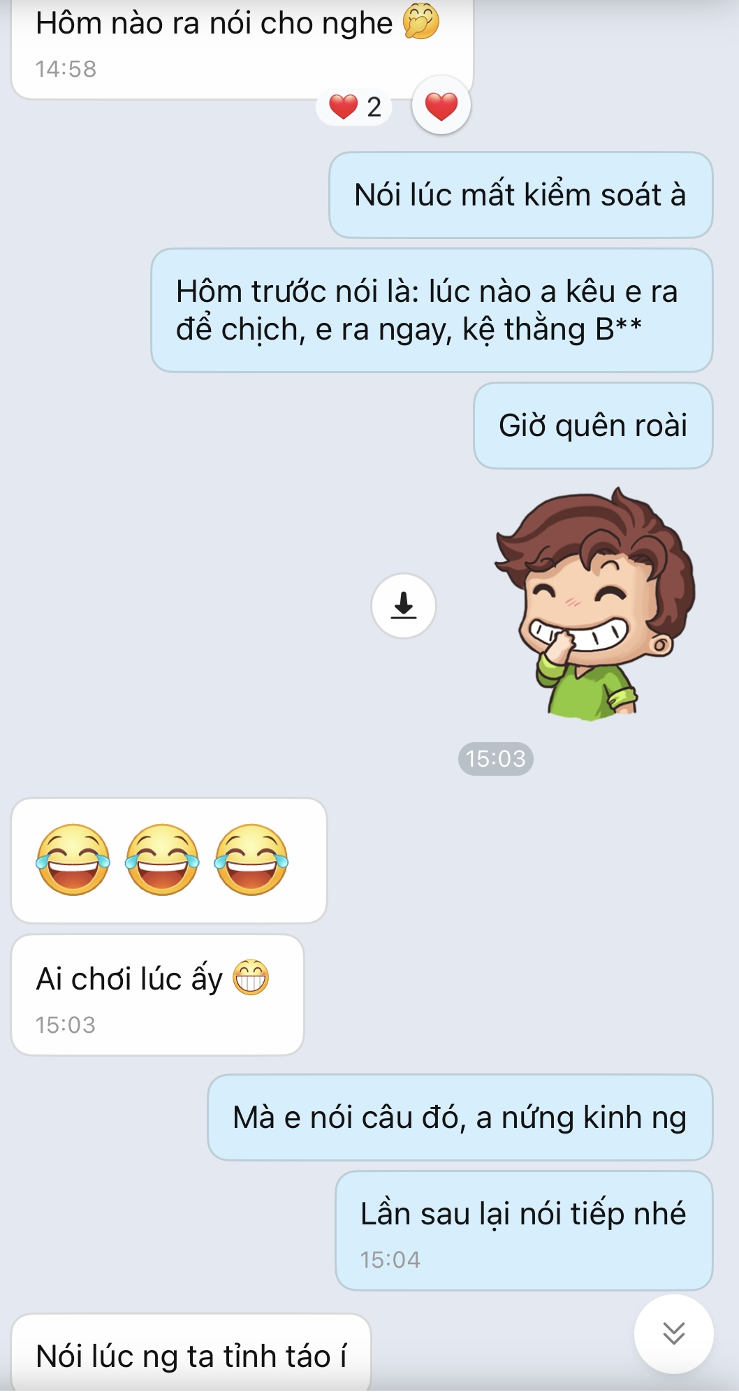 Tổng cộng lúc đó đến h 4 lần cf với nó, lần cuối cùng cách đây 4 hôm, t đè ra hôn má, bóp vú, hôn nhẹ vô môi. Nó có xô ra ,nhưng vẫn cho.
