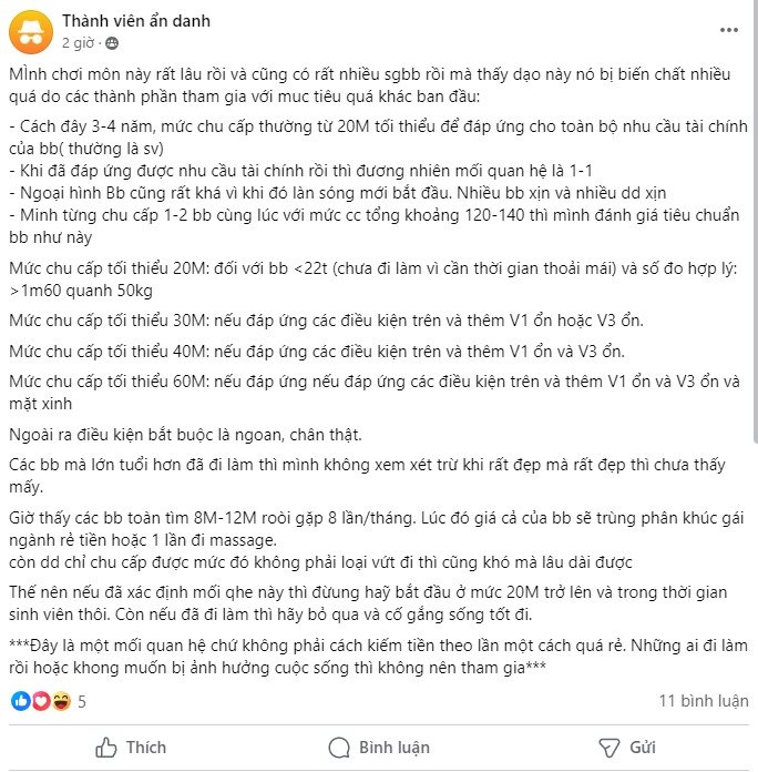 Chuẩn chỉ giờ chỉ gặp theo lần thôi, chu cấp theo tháng chúng nó cầm xong biến ngay. Giá vẫn vậy 2-3m/lần gặp không hơn. Con nào ngáo giá quá bỏ qua hết.