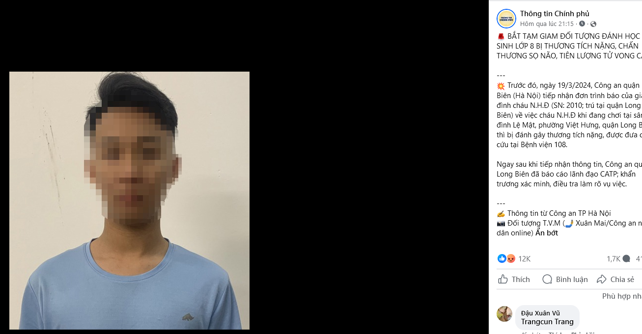 Tối 27-3, Cơ quan cảnh sát điều tra Công an quận Long Biên (Hà Nội) đã ra quyết định khởi tố bị can, lệnh bắt bị can để tạm giam đối với Trương Văn Minh (16 tuổi, trú quận Long Biên, học sinh lớp 10, Trung tâm giáo dục thường xuyên Việt Hưng) để điều tra về tội cố ý gây thương tích.