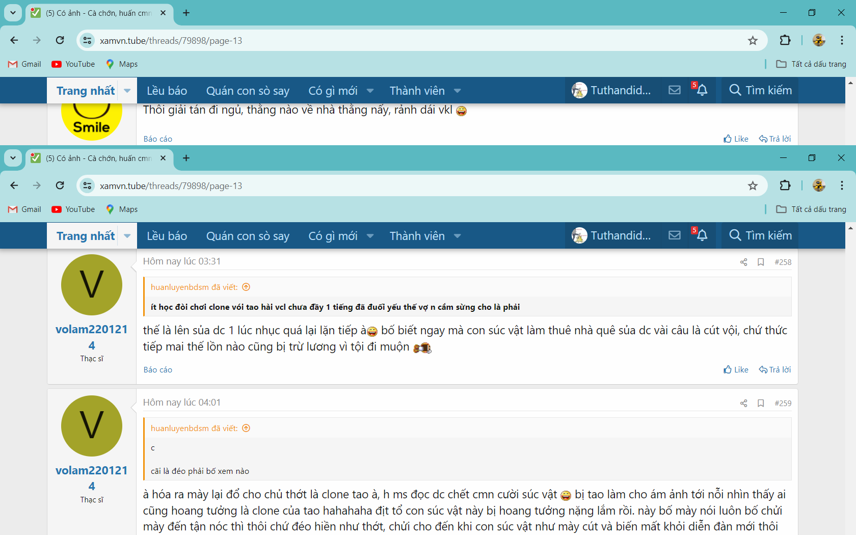 2 thằng nhà quê chửi hăng quá quên đổi clone tao khịa cho sấp mặt chó ra cuối cùng đổi clone đc 3 lần nhưng 20 phút mới đổi 1 con clone , đuối lý quá phải lôi dàn clone ra ngày 20-5 chửi hùa cho trôi đi nhưng vẫn còn sạn là tại sao 10 thằng 2h đêm đi ngủ lại cùng đậy đúng 8h sáng -=)))))) thần giao cách cảm à hay ngủ 4 tiếng 6 tiếng là thói quen chung hay 1 thằng dùng 10 clone nên sủa cách nhau 5 giây cả 10 thằng