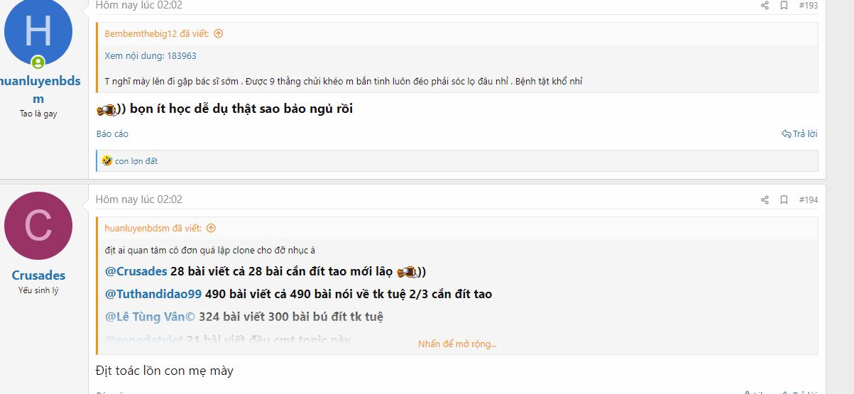 vài 11h 30 ngày 20-5 clone @Crusade chửi Cái địt con mẹ mày trong sựu bất lực vì đéo cãi đc @Bembemthebig12 @Tuthandidao99 thì đã đăng xuất ra nên đéo vào giúp sức đc ( trang số 23)