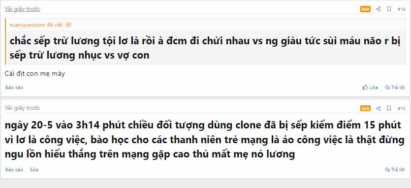 ngày 20-5 topic số 17 10 clone trốn hết chỉ dám dùng 1 clone Oldboy để rep tao nhưng thời gian rep là viết 10 chữ mà 14h39-14h42 mới xong. từ đó các tn ở trang 30 đều mất 3-5 phút , tự xưng là chủ tịch nhưng sợ sếp trừ lương phải dùng điện thoại lén