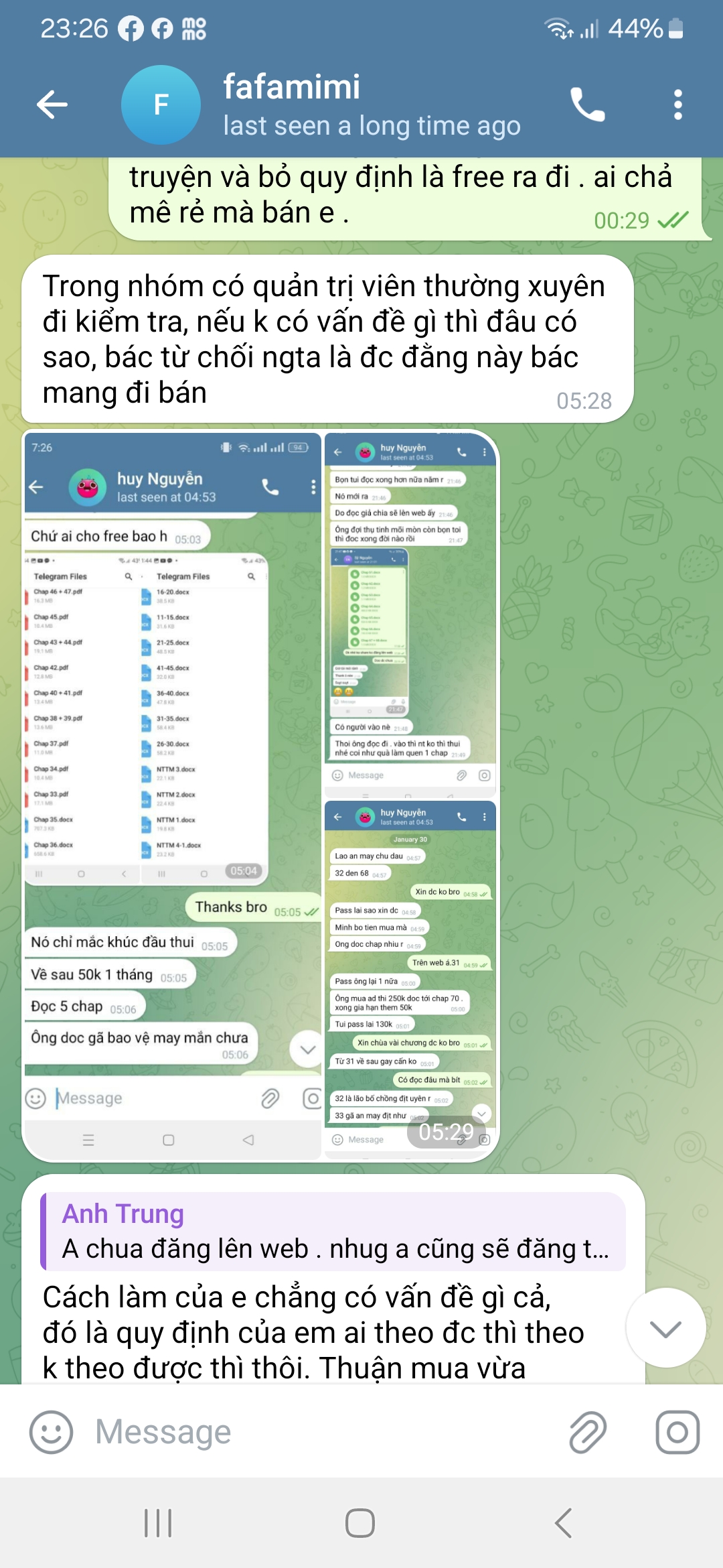 để tao đưa tên ra nhaaa. Đưa cái mã cha dòng họ nhà mày . Mày nghĩ ai cũng ngu như mày à . đưa ra để mày báo fafamimi kick ra nhóm nữa à . Thằng fafamimi nó đưa ra quy định như này . Bác nào tìm được người leak truyện báo nó . No tặng free cho 2 tháng lúc đầu tao đéo biết. Cứ thấy ai nt mua truyện kiểu như ae vs nhau trong group ae mình chia 50 50 cho tình cảm đôi bên có lợi thế là qua ngày hôm sau bị kick .nt tml fafamimi kêu bác leak truyện đem bán .