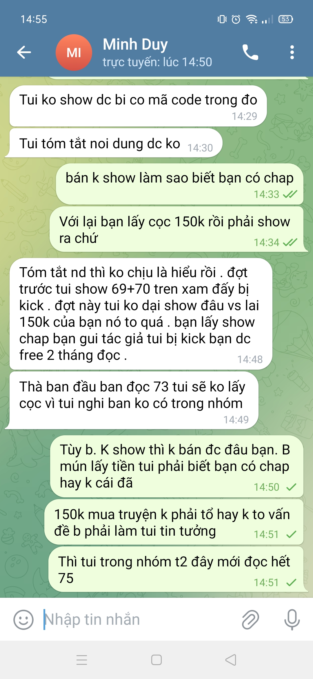 Zl.fb.tele..nó đều lừa cùng thủ đoạn. Bảo có chap kêu tiền cọc tiền mua chap xong bảo show chap ra coi đúng k thì vòng vo này nọ thấy k lùa đc quay ra cái thói nói chuyện giọng bắt nạt..ae coi hết sức cẩn thận vs thằng nàyM trả tiền t đi, zalo t nhắn mày cả trăm tin mk rep. Giờ tạo nick mới đi lừa hả? Dù m có lập trăm nick cũng k lừa đc ai đâu. Vì cái cách m làm việc cẩu thả lừa đảo nó ăn sâu vào máu r. Ng ta đọc cái mô tip là biết. Giờ còn đòi nộp phí làm tin 150k?? M nghĩ m là tác giả hay gì??