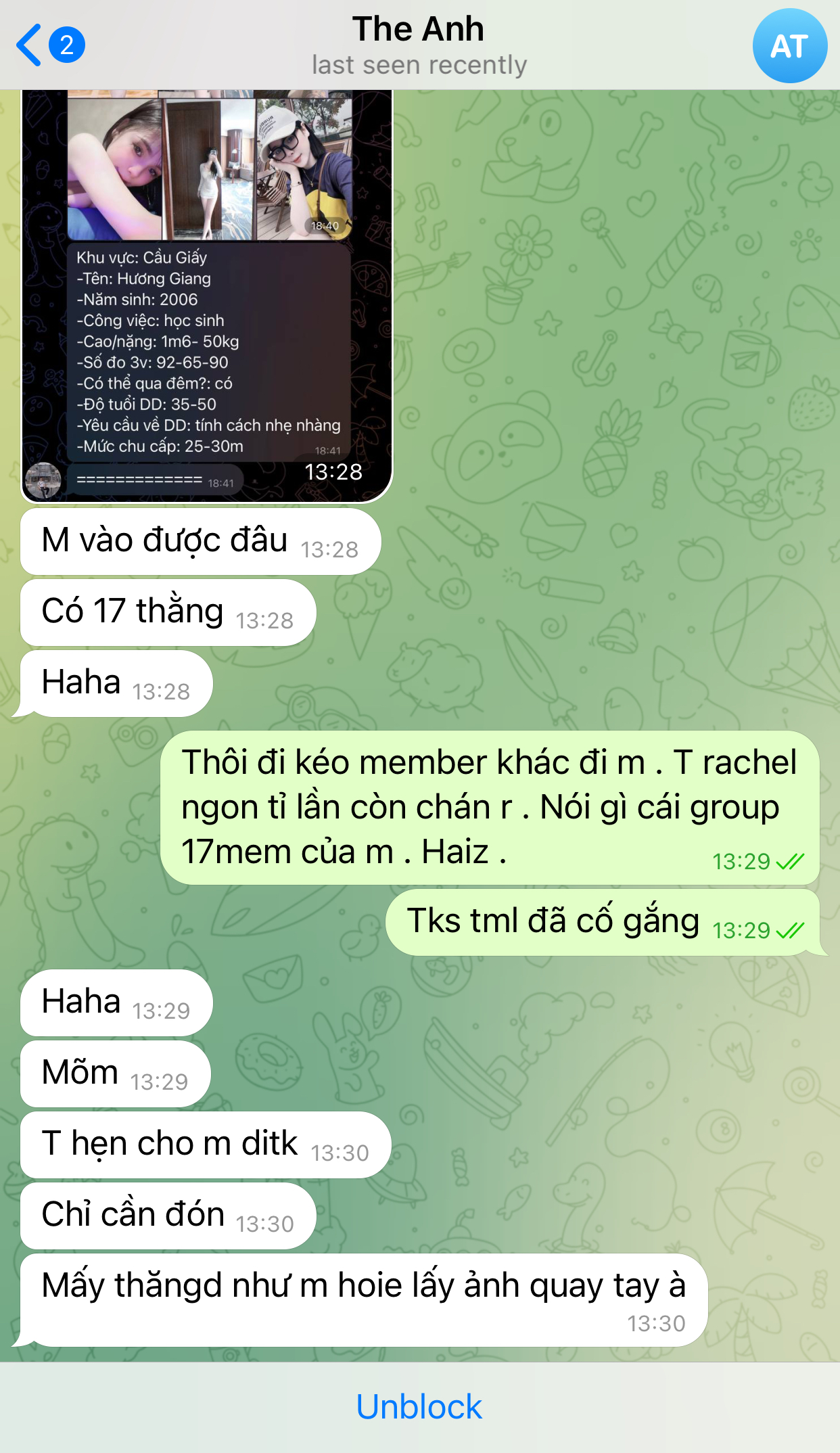 Cái địt mẹ , có cái group bẩn , mấy con phò rách mà m định trèo kéo ai , bố m đã khách sáo cảm ơn rồi còn thích thượng đẳng à . Câm và cút . Tiền t có nhưng đéo ngu .