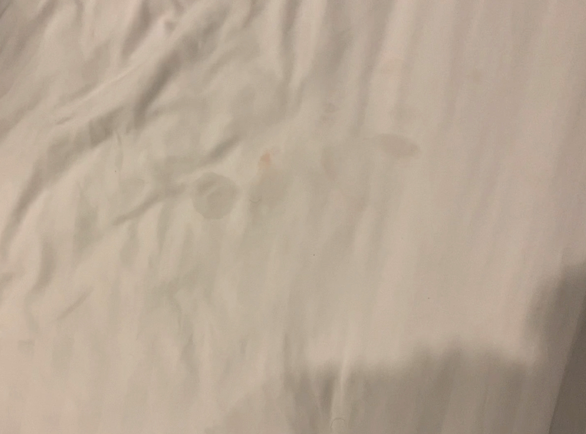 Lúc t rút ra thì thấy có màu đỏ cam nhạt dính ở bao, ở dịch trên mu e ấy, dính cả lên ga giường.
