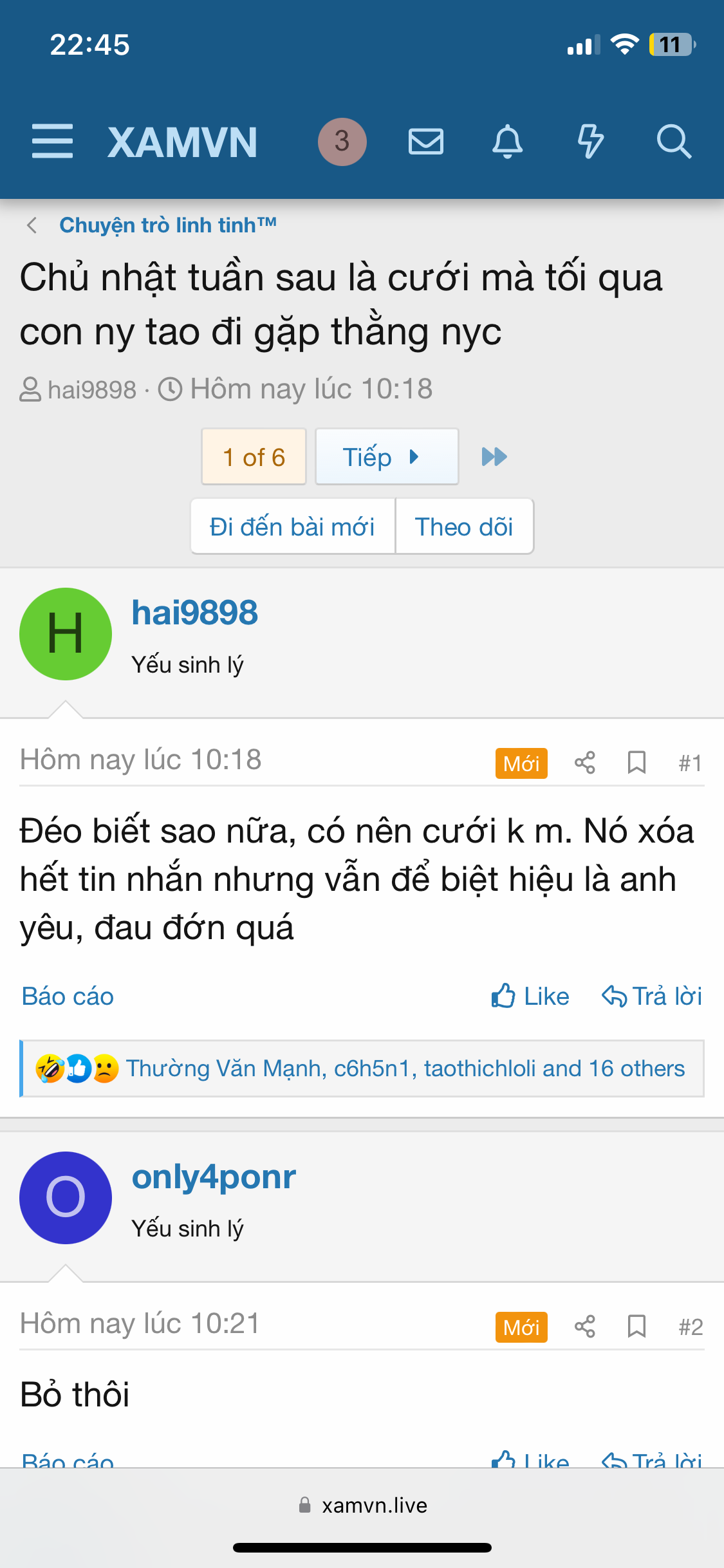 Tao cũng mới thôi 1 em 97. Quen thằng bồ 7 năm rồi, mà em nó vẫn trốn nhà đi đêm với tao.