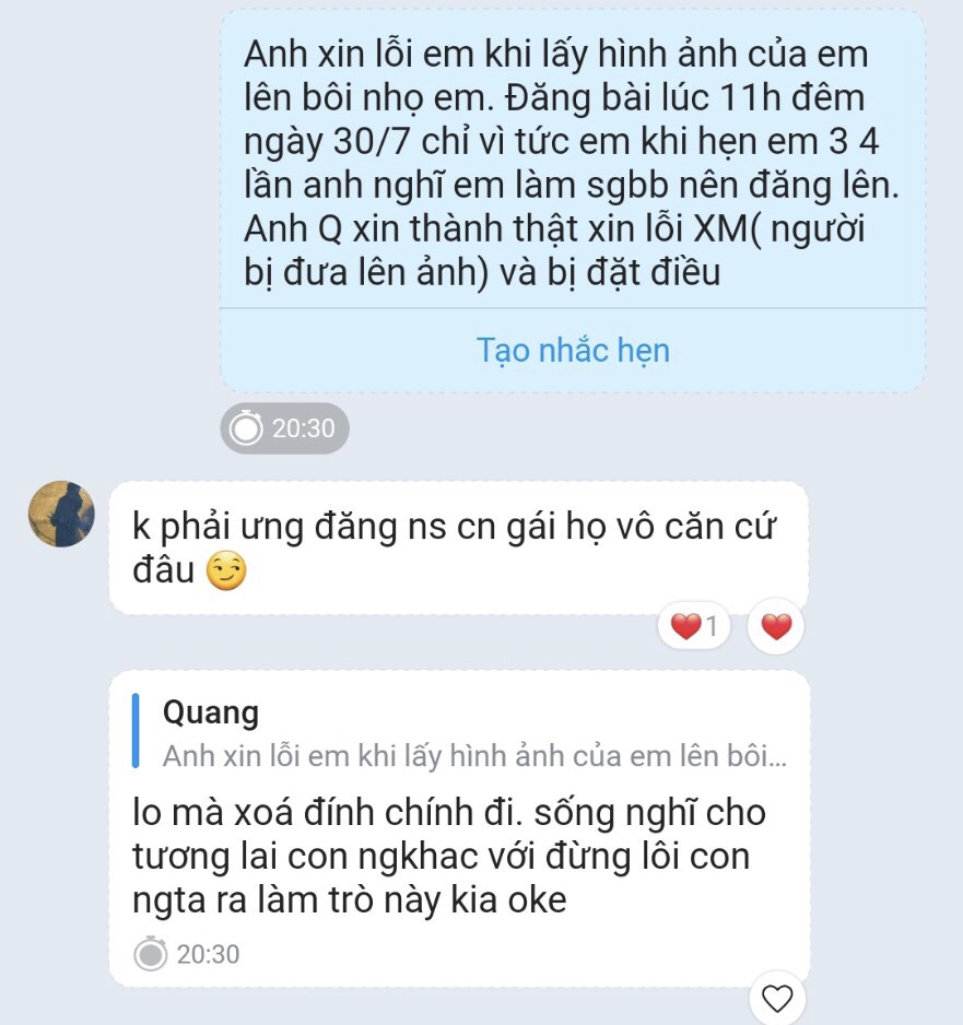 mày xin lỗi ít gì, lôi ảnh nó ra kêu làm sgbb các kiểu, giờ có thằng người quen báo nó, nó báo lên điều tra các kiểu thì nhục mặt =}] dăm ba cái địa chỉ ip nó còn lù lù ra đóXin lỗi vì bôi nhọ, xin lỗi lôi người không liên quan bịa đặt vào câu chuyện xin lỗi rất nhiều