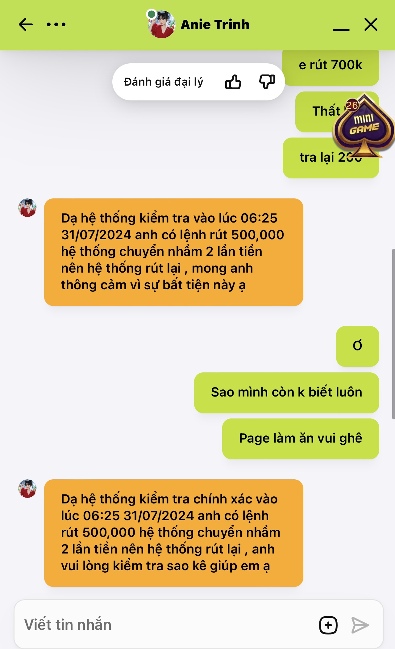 bảo nó gửi giao dichĐm. SV88 lấy tiền người chơi. Kêu là chuyển ngầm xong lấy lại tiền. Chuyển nhầm ngày 31/7 mà đến 4/8 mới đòi. Kêu KH xem lại sao kê. Vkl
