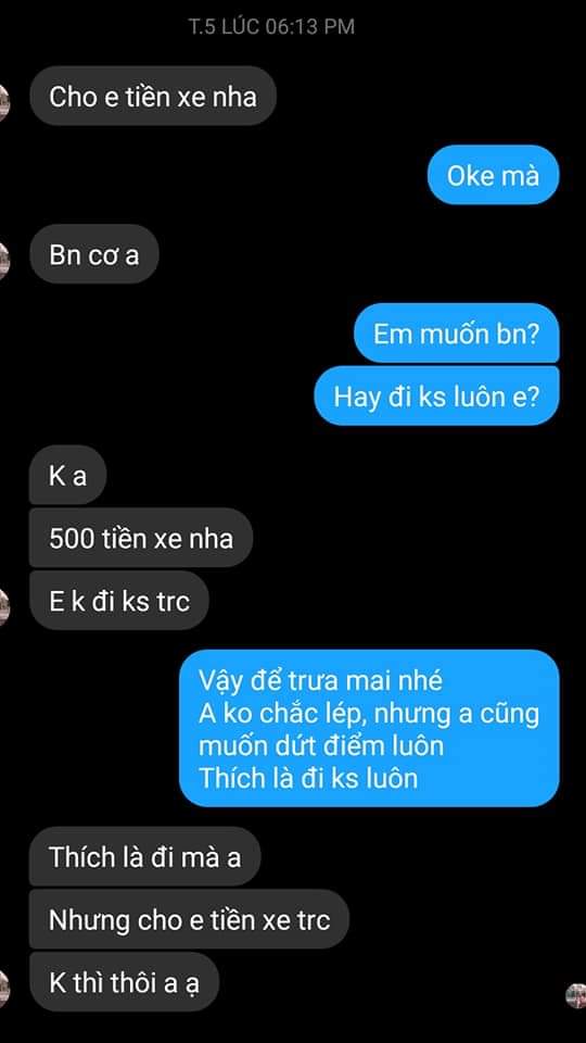 Cũng đòi tiền quà trước, có cô thì gọi đó là "tiền xe". Tôi bảo để a đặt xe cho em, cũng ko chịu luôn.