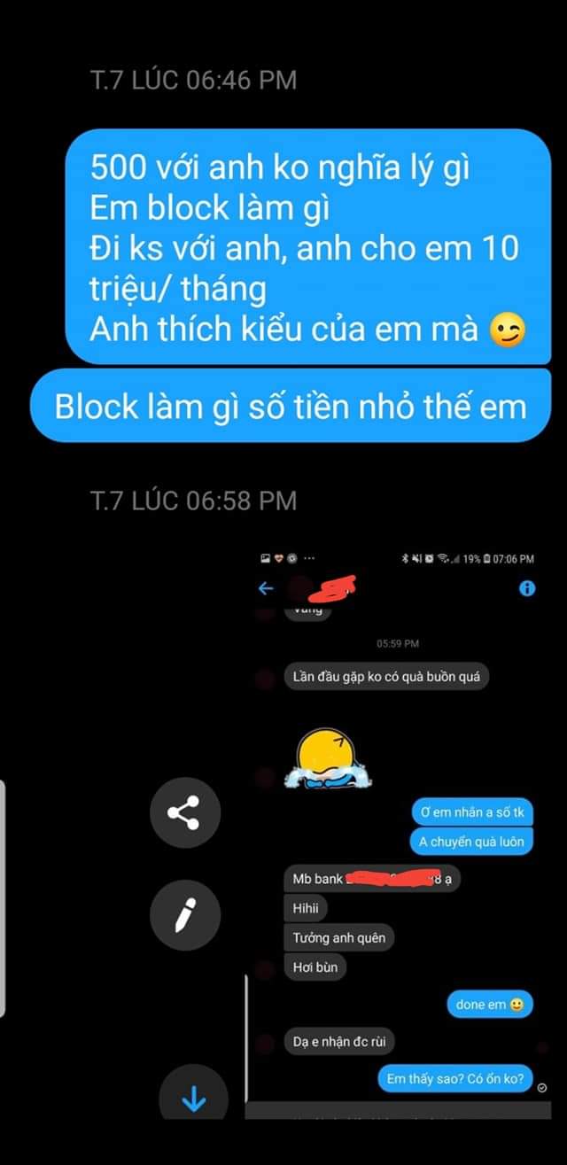 2/ Nếu bạn là DD, đừng bao giờ chuyển tiền, hoặc chuyển 1 chút thôi. Không phải tiếc, mà là bị cười vào mũi thì vẫn luôn khó chịu. Nếu bạn hào phóng, thì sau khi gặp thật, quan hệ thật, bạn có thể quà cho BB thêm vẫn rất thoải mái mà vui. Còn hơn mất 500 một triệu mà ức vì bị lừa.